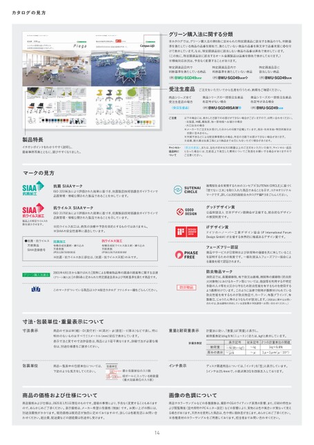 カタログの見方グリーン購入法に関する分類本カタログでは、グリーン購入法の第6条に定められた特定調達品に該当する商品のうち、判断基準を満たしている商品の品番を緑色で、満たしていない商品の品番を黒文字で品番末尾に❖を付けて表示しています。なお、特定調達品目に該当しない商品の品番は黒色で表示しています。(この他に、特定調達品目に該当するオール金属製品は品番を緑色で表示しております。)※環境対応状況は、予告なく変更することがあります。特定調達品目内で判断基準を満たしている商品特定調達品目内で判断基準を満たしていない商品特定調達品目に該当しない商品(例)BWU-SGD49SAW受注生産品(例)BWU-SGD49SAW❖(例)BWU-SGD49SAWご注文をいただいてから生産を行うため、納期をご確認ください。商品シリーズ全て受注生産品の場合〈受注生産品〉商品シリーズの一部受注生産品色記号がない場合商品シリーズの一部受注生産品色記号がある場合(例)BWU-SGD49SAWΩ(例)BWU-SGD49SAWご注意以下の場合には、表示した日数でのお届けができない場合がございますので、お問い合わせください。・北海道、沖縄、離島部、他一部地域へお届けの場合・大口注文の場合※メーカーでご注文をお受けした日からの日数で記載しています。祝日・年末年始・特別休業日は日数に含みません。※天候不良などによる配送事情悪化の場合、所定の日数でお届けできない場合があります。※金庫、耐火庫は生産工程により納品までお日にちをいただく場合があります。キャンセル・返品料について〈受注生産品〉、または、当社の定める大口数量以上のご注文をいただいた後で、キャンセル・返品となった場合には、生産途上で発生した費用についてご負担をお願いする場合がありますのでご注意ください。循環型社会を実現するためのコンセプト「SUTENAICIRCLE」に基づく「捨てない工夫」を取り入れた商品であることを示す、コクヨオリジナルマークです。詳しくは2025版総合カタログF編P.5をごらんください。グッドデザイン賞公益財団法人日本デザイン振興会が主催する、総合的なデザインの推奨制度です。iFデザイン賞ドイツのハノーバー工業デザイン協会(iFInternationalForumDesignGmbH)が主催する世界的に権威あるデザイン賞です。フェーズフリー認証商品やサービスが日常時および非常時の価値を共に有していることを証明するための制度です。一般社団法人フェーズフリー協会による審査を経て認証されます。防炎物品マーク消防法では、高層建築物、地下街又は劇場、病院等の建築物(防炎防火対象物)におけるカーテン等については、施設等を利用する不特定多数の人々等を火災から守るため防炎性能を有するものを使用するよう義務付けています。このように法律で使用が義務付けられている防炎性能を有するものが防炎物品で、カーテン、布製ブラインド、布製衝立、じゅうたん等のようなものが該当します。(消防法に関するお問い合わせは、該当建物の所在している消防署の予防課等へお問い合わせください。)製品特長イチオシポイントをわかりやすく説明し、最新事例写真とともに、選びやすくなりました。マークの見方抗菌SIAAマークISO22196法により評価された結果に基づき、抗菌製品技術協議会ガイドラインで品質管理・情報公開された製品であることを示しています。抗ウイルスSIAAマークISO21702法により評価された結果に基づき、抗菌製品技術協議会ガイドラインで品質管理・情報公開された製品であることを示しています。※抗ウイルス加工は、病気の治療や予防を目的とするものではありません。※SIAAの安全性基準に適合しています。製品上の特定ウイルスの数を減少させます。●抗菌・抗ウイルス天板商品SIAA登録番号抗菌加工有機合成抗菌剤・練り込み天板表面JP0112675X0001E※抗菌・抗ウイルス加工部位は、抗菌・抗ウイルス天板〉のみです。抗ウイルス加工有機合成抗ウイルス加工剤・練り込み天板表面JP0612675X0004Mグリーン購入法適合2001年4月1日から施行された[国等による環境物品等の調達の推進等に関する法律(グリーン購入法)]の第6条に定められた特定調達品目および判断基準を満たす商品です。ßこのマークがついている商品はコクヨ総合カタログファニチャー編をごらんください。防炎物品寸法・包装単位・重量表示について寸法表示商品の寸法はW(幅)・D(奥行き)・H(高さ)・φ(直径)・t厚み)などで表し、特に明示のないものはすべてミリメートル(mm)単位で表示しています。表示寸法と実寸の寸法許容差は、商品により若干異なります。詳細寸法が必要な場合は、別途仕様書をご請求ください。重量と耐荷重表示計量法に従い、重量」は「質量」と表示し、耐荷重表記はkgをN(ニュートン)または、kgfと表示しています。計量法表記耐荷重厚みの表示表示記号ニュートン〜N(約〜kgf)〜μmマイクロメートル従来記号〜kg〜μ2つの計量単位の関連1kg≒9.8N1μ=1μm(μ:10-6)包装単位商品一覧表中の包装単位については、下記のよう
