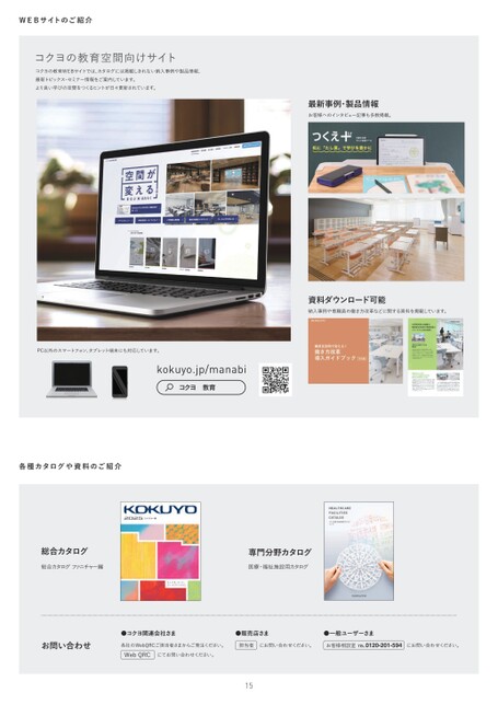 WEBサイトのご紹介コクヨの教育空間向けサイトコクヨの教育WEBサイトでは、カタログには掲載しきれない納入事例や製品情報、最新トピックス・セミナー情報をご案内しています。より良い学びの空間をつくるヒントが日々更新されています。最新事例・製品情報お客様へのインタビュー記事も多数掲載。資料ダウンロード可能納入事例や教職員の働き方改革などに関する資料を掲載しています。PC以外のスマートフォン、タブレット端末にも対応しています。kokuyo.jp/manabiコクヨ教育各種カタログや資料のご紹介総合カタログ総合カタログファニチャー編専門分野カタログ医療・福祉施設用カタログお問い合わせ●コクヨ関連会社さま●販売店さま●一般ユーザーさま各社のWebQRCご担当者さまからご発注ください。担当者にお問い合わせください。お客様相談室TEL.0120-201-594にお問い合わせください。WebQRCにてお問い合わせください。15