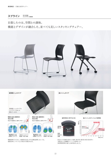 普通教室|児童生徒用チェアースプライン2018年度グッドデザイン賞受賞目指したのは、空間との調和。機能とデザインが融合した、並べても美しいスタッキングチェアー。座樹脂シェルタイプ座メッシュタイプ藤沢翔陵高等学校様座枠形状に対する工夫座メッシュのクッション性評価弾性糸なしメッシュの座面弾力性に富む弾性糸入りメッシュの座面るいにて性れ復元優51015202530354045変位[mm]1000900800700600500400300200100荷重[N]00メッシュ領域最大化365mm座枠幅最小化前部枠当たり改善枠当たりの改善を追求した座枠、弾力性・復元性・耐久性を持つ「弾性糸入り高機能メッシュ」の採用により、長時間使用時の座り心地を追求しました。座樹脂シェルタイプはメンテナンス性にも優れています。聴講(後傾)姿勢時の体圧分散筆記(前傾)姿勢時の体圧分散体圧が「座面後方」に集中しやすい体圧が「座面前方」に集中しやすいSplineの座面(座樹脂シェルタイプ)一般的なシェルタイプ(樹脂製・木製)の座面Splineの座面(座樹脂シェルタイプ)一般的なシェルタイプ(樹脂製・木製)の座面前前聴講姿勢だけでなく、大腿部を圧迫しがちな筆記姿勢においても、座面全体にバランスよく体圧が分散されます。22