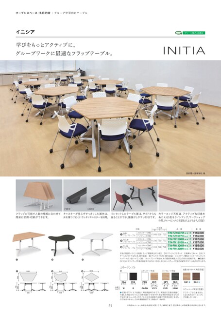 オープンスペース・多目的室|グループ学習向けテーブルイニシアグリーン購入法適合学びをもっとアクティブに。グループワークに最適なフラップテーブル。高松第一高等学校様フラップが可能で人数の増減に合わせて簡単に使用・収納ができます。LOCKFREEキャスターが見えずすっきりした脚先は、床を傷つけにくいウレタンキャスターを採用。インセットしたテーブル脚は、サイドからも座ることができ、議論がしやすい形状です。カラーエッジ天板は、アクティブな印象をあたえる5色をラインアップ。ワークショップの際、グルーピングの視認性が上がります。別製)仕様❶台形フラップテーブル❷勾玉形フラップテーブル❸ひし形フラップテーブルスタンダード天板ハイグレード天板スタンダード天板ハイグレード天板スタンダード天板ハイグレード天板外寸法DWH156569572012407607201315790720品番価格TIN-FZ1607M-W・B¡1TIN-FZ1607H-W・B¡1TIN-FM1208M-W・B¡1TIN-FM1208H-W・B¡1TIN-FH1308M-W・B¡1TIN-FH1308H-W・B¡1¥155,000¥155,000¥167,000¥167,000¥155,000¥155,000天板/表面材:メラミン化粧板、エッジ:樹脂押出材(ABS)芯材:パーティクルボード天板厚み:24mm支柱/スチール丸パイプ(φ50.8、焼付塗装)脚/アルミダイカスト(焼付塗装)キャスター/薄型キャスター(ウレタンストッパー付き2個/ナイロン2個)※ハイグレード天板は、木の質感を再現した凹凸のある化粧板です。●品番内の□には、スタンダード天板の色記号(PWPW・Y3Y3)、またはハイグレード天板の色記号(P1P1・U8U8)が入ります。1315カラーサンプル脚スタンダード天板ハイグレード天板抗菌・抗ウイルス天板(別製)品番内色記号SAAホワイトE6AブラックPAWホワイトMY3ティンバーミディアムMP1ナチュラルオークMU8グラファイトダークグレーXA1XA5BPWPWWU8U8抗菌・抗ウイルス性能は、天板表面材のみです。本製品の天板は表面に付着した特定のウイルスの数を減少させますが、感染予防を保証するものではありません。また、抗ウイルス加工は病気の治療や予防を目的とするものではありません。SIAA登録製品です。詳細はP.14参照。Y3Y3P1P1カラーエッジ天板(別製)アクティブな印象をあたえる5色のカラーエッジもご用意しています。48※価格はメーカー希望小売価格(税抜)です。消費税、組立・配送費などの諸経費を別途申し受けます。565575435❸❸7905827201240❷❷7605827201565❶❶695582720