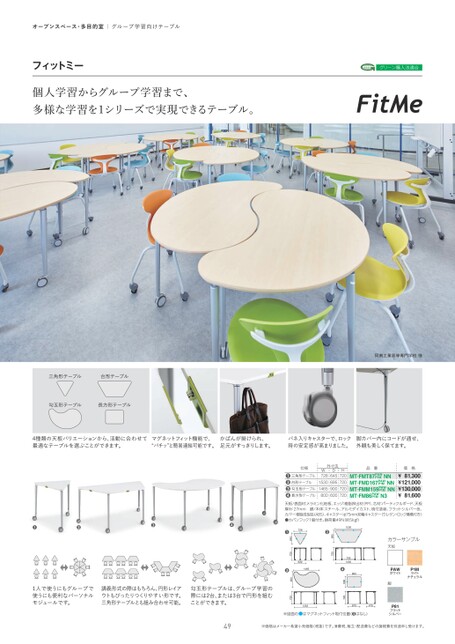 オープンスペース・多目的室|グループ学習向けテーブルフィットミーグリーン購入法適合個人学習からグループ学習まで、多様な学習を1シリーズで実現できるテーブル。三角形テーブル台形テーブル勾玉形テーブル長方形テーブル阿南工業高等専門学校様4種類の天板バリエーションから、活動に合わせて最適なテーブルを選ぶことができます。マグネットフィット機能で、“パチッ”と簡易連結可能です。かばんが掛けられ、足元がすっきりします。バネ入りキャスターで、ロック時の安定感が高まりました。脚カバー内にコードが通せ、外観も美しく保てます。49※価格はメーカー希望小売価格(税抜)です。消費税、組立・配送費などの諸経費を別途申し受けます。仕様品番価格外寸法W72815301465800D645695900600H720720720720P1M❶三角形テーブル❷台形テーブル❸勾玉形テーブル❹長方形テーブル天板/表面材:メラミン化粧板、エッジ:樹脂押出材(PP)、芯材:パーティクルボード、天板厚み:27mm脚/本体:スチール、アルミダイカスト、焼付塗装、フラットシルバー色、カバー:樹脂成型品(ABS)、キャスター:φ75mm双輪キャスター(ウレタン・ロック機構付き)●カバンフック1個付き。耐荷重49N(約5kgf)MT-FMT87PAW・MT-FMD167PAW・MT-FMM159PAW・MT-FM86PAW・N381,300¥¥121,000¥130,000¥81,600NNNNNNP1MP1MP1Mカラーサンプル天板P1MライトナチュラルPAWホワイト脚P81フラットシルバー7321430800MT-FMD167❹6007201530695720❷632MT-FMT871465645720900720❸❶7281252670470※図面の●はマグネットフィット取付位置(❸はなし)MT-FMM159MT-FM86❶❷❸❹1人で使うにもグループで使うにも便利なパーソナルモジュールです。講義形式の際はもちろん、円形レイアウトもぴったりつくりやすい形です。三角形テーブルとも組み合わせ可能。勾玉形テーブルは、グループ学習の際には2台、または3台で円形を組むことができます。