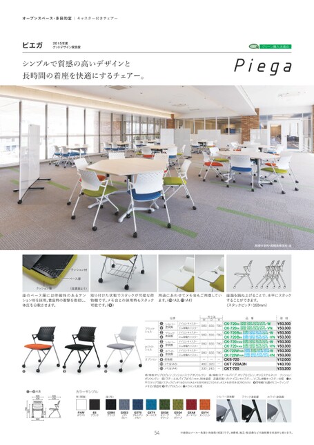 取り付けた状態でスタックが可能な荷物棚です。メモ台との併用時もスタック可能です。❾)オープンスペース・多目的室|キャスター付きチェアーピエガ2015年度グッドデザイン賞受賞シンプルで質感の高いデザインと長時間の着座を快適にするチェアー。テンション材ベース層クッション層(座裏面より)座のベース層には伸縮性のあるテンション材を採用。着座時の衝撃を吸収し、体圧を分散させます。仕様グリーン購入法適合高槻中学校・高槻高等学校様品番価格ブラックシェルホワイトシェルオプションブラック塗装脚シルバー塗装脚シルバー塗装脚❶❷❸❹❺❻❼❽❾荷物棚メモ台(A3)メモ台(A4)ホワイト塗装脚ナイロンキャスターゴム単輪キャスターナイロンキャスターゴム単輪キャスターナイロンキャスターゴム単輪キャスターナイロンキャスターゴム単輪キャスター外寸法DWH560555790560555790560555790560555790ー460330ー320245ーーーGXB6¿GXE3¿GXT6¿GXT4GXQ5¿GXQ4¿GXA8¿GXY4GXB6¿GXE3¿GXT6¿GXT4GXQ5¿GXQ4¿GXA8¿GXY4-W-VN-W-VN-W-VN-W-VNCK-720E6CK-720E6CK-720BE6CK-720BE6CK-720PAWGXB6¿GXE3¿GXT6¿GXT4CK-720PAWGXB6¿GXE3¿GXT6¿GXT4CK-720WPAWGXB6¿GXE3¿GXT6¿GXT4CK-720WPAWGXB6¿GXE3¿GXT6¿GXT4CKS-720CKT-720A3NCKT-720GXB6¿GXE3¿GXT6¿GXT4GXQ5¿GXQ4¿GXA8¿GXY4GXB6¿GXE3¿GXT6¿GXT4GXQ5¿GXQ4¿GXA8¿GXY4GXQ5¿GXQ4¿GXA8¿GXY4GXQ5¿GXQ4¿GXA8¿GXY4GXQ5¿GXQ4¿GXA8¿GXY4GXQ5¿GXQ4¿GXA8¿GXY4¥50,300¥50,300¥50,300¥50,300¥50,300¥50,300¥50,300¥50,300¥12,000¥40,700¥33,200背/背板:ポリプロピレン、クッション:スラブポリウレタン座/座板:スチールパイプ、ポリプロピレン、ポリエステルネットクッション:ポリウレタン脚/スチール丸パイプφ19.1mm、粉体塗装品番末尾/-W:ナイロンキャスター、-V:ゴム単輪キャスター仕様●水平スタック可能/スタックピッチ160mm(A4メモ台付きは210mm、A3メモ台付きは290mm)❾荷物棚/丸鋼・PEコーティングメモ台/表面材:ポリプロピレン、メラミン化粧板GXT6プルシアンブルーシルバー塗装脚ブラック塗装脚ホワイト塗装脚GXA8カーマインGXY4タンジェリンGXT4ターコイズGXQ5オリーブグリーンGXQ4ライトオリーブ54※価格はメーカー希望小売価格(税抜)です。消費税、組立・配送費などの諸経費を別途申し受けます。PAWホワイトE6ブラックGXB6ブラックGXE3ソフトグレー560CK-(M)720W・B)435625790❶〜❽共通520430555435カラーサンプル背(樹脂)座(布)●●●