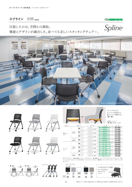 オープンスペース・多目的室|キャスター付きチェアースプライン2018年度グッドデザイン賞受賞グリーン購入法適合目指したのは、空間との調和。機能とデザインが融合した、並べても美しいスタッキングチェアー。学校法人岩崎学園情報科学専門学校様モールドウレタンクッションを採用した座クッション構造です。(❺〜❽)座樹脂シェルタイプ(❶〜❹)の特長は.22P品番価格K11-S200W-BK1K11-S200U-BK1K11-S200W-E21K11-S200U-E21K11-S200W-PW1K11-S200U-PW1K11-B200W-BK1K11-B200U-BK1K11-S210W-BKB61K11-S210U-BKB61K11-S210W-E2E21K11-S210U-E2E21K11-S210W-PWE21K11-S210U-PWE21K11-B210W-BKB61K11-B210U-BKB61¥51,500¥51,500¥51,500¥51,500¥51,500¥51,500¥51,500¥51,500¥64,500¥64,500¥64,500¥64,500¥64,500¥64,500¥64,500¥64,500背/ポリプロピレン座/❶〜❹強化ナイロン、ポリプロピレン❺〜❽強化ナイロン、ポリプロピレン、モールドウレタン脚フレーム/アルミダイカスト、メラミン焼付塗装スタックピッチ/210mm●品番内W:ナイロンキャスター、U:ポリウレタン巻きキャスター56※価格はメーカー希望小売価格(税抜)です。消費税、組立・配送費などの諸経費を別途申し受けます。メモ台付きタイプ(別製)詳しくは担当者までお問い合わせください。BKブラックBK品番内色記号E2ライトグレーE2PAWホワイトPWG4B6ブラックB6G4E2ライトグレーE2595K11-(B・S)200595K11-(B・S)210455435810810〜❶❹420565450〜❺❽435565465水平スタックカラーサンプル本体(樹脂)座(布)❹❺❷❻❸❼50mm座タイプ樹脂シェルタイプクッションタイプ脚タイプ❶ブラックシェルシルバー塗装脚❷ライトグレーシェルブラック塗装脚❸ホワイトシェル❹ブラックシェル❺ブラックシェルシルバー塗装脚❻ライトグレーシェル❼ホワイトシェル❽ブラックシェルブラック塗装脚キャスターナイロンポリウレタン巻きナイロンポリウレタン巻きナイロンポリウレタン巻きナイロンポリウレタン巻きナイロンポリウレタン巻きナイロンポリウレタン巻きナイロンポリウレタン巻きナイロンポリウレタン巻き