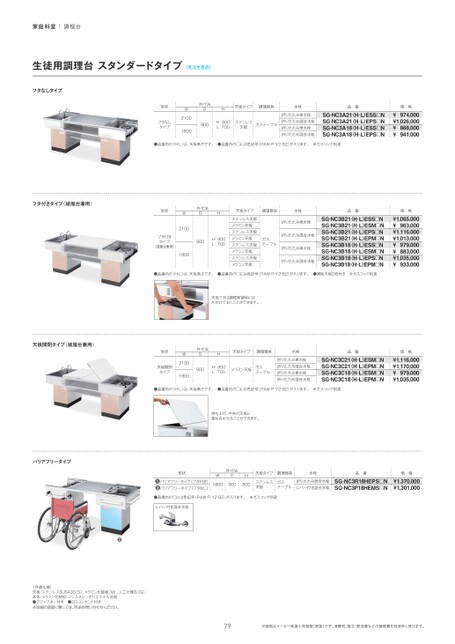 家庭科室|調理台生徒用調理台スタンダードタイプ〈受注生産品〉フタなしタイプ形状フタなしタイプW21001800外寸法DH天板タイプ調理器具水栓品番900H:800L:700ステンレス天板ガステーブル折りたたみ単水栓折りたたみ混合水栓折りたたみ単水栓折りたたみ混合水栓SG-NC3A21(H¿L)ESS¡NSG-NC3A21(H¿L)EPS¡NSG-NC3A18(H¿L)ESS¡NSG-NC3A18(H¿L)EPS¡N●品番内の(H・L)は、天板高さです。●品番内の□には色記号(PAW・P・Y2・B2)が入ります。※ガスコック別途フタ付きタイプ(被服台兼用)形状外寸法DHW天板タイプ調理器具水栓品番フタ付きタイプ(被服台兼用)21001800900H:800L:700ステンレス天板メラミン天板ステンレス天板メラミン天板ステンレス天板メラミン天板ステンレス天板メラミン天板ガステーブル折りたたみ単水栓折りたたみ混合水栓折りたたみ単水栓折りたたみ混合水栓SG-NC3B21(H¿L)ESS¡NSG-NC3B21(H¿L)ESM¡NSG-NC3B21(H¿L)EPS¡NSG-NC3B21(H¿L)EPM¡NSG-NC3B18(H¿L)ESS¡NSG-NC3B18(H¿L)ESM¡NSG-NC3B18(H¿L)EPS¡NSG-NC3B18(H¿L)EPM¡N●品番内の(H・L)は、天板高さです。●品番内の□には色記号(PAW・P・Y2・B2)が入ります。●補助天板2枚付き※ガスコック別途天板フタは調理実習時には片付けておくことができます。天板開閉タイプ(被服台兼用)形状天板開閉タイプW21001800外寸法DH天板タイプ調理器具水栓品番900H:800L:700メラミン天板ガステーブル折りたたみ単水栓折りたたみ混合水栓折りたたみ単水栓折りたたみ混合水栓SG-NC3C21(H¿L)ESM¡NSG-NC3C21(H¿L)EPM¡NSG-NC3C18(H¿L)ESM¡NSG-NC3C18(H¿L)EPM¡N●品番内の(H・L)は、天板高さです。●品番内の□には色記号(PAW・P・Y2・B2)が入ります。※ガスコック別途価格974,000¥¥1,026,000¥888,000¥941,000価格¥1,065,000¥963,000¥1,116,000¥1,013,000¥979,000¥883,000¥1,035,000¥933,000価格¥1,116,000¥1,170,000¥979,000¥1,035,000持ち上げ、中央の天板に重ね合わせることができます。天板タイプ調理器具水栓品番価格ステンレス天板ガステーブル折りたたみ混合水栓レバー付き混合水栓SG-NC3R18HEPS¡NSG-NC3P18HEMS¡N¥1,370,000¥1,301,000バリアフリータイプ形状❶バリアフリータイプ(フタ付き)❷バリアフリータイプ(フタなし)外寸法DWH1800900800●品番内の□には色記号(PAW・P・Y2・B2)が入ります。※ガスコック別途レバー付き混合水栓❷〈共通仕様〉天板/ステンレスSUS430(S)、メラミン化粧板(M)、人工大理石(G)本体/メラミン化粧板、ノンスチレンポリエステル合板●アジャスター付き●2口コンセント付き※詳細の図面に関しては、別途お問い合わせください。79※価格はメーカー希望小売価格(税抜)です。消費税、組立・配送費などの諸経費を別途申し受けます。