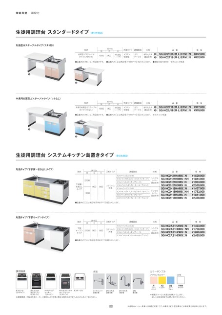 家庭科室|調理台生徒用調理台スタンダードタイプ〈受注生産品〉対面型ガステーブルタイプ(フタ付き)形状外寸法DHW対面型ガステーブルタイプ(フタ付き)1800900M:760L:700メラミン化粧板ガステーブル折りたたみ混合水栓❶❷SG-NC2S18(M¿L)EPM¡NSG-NC2T18(M¿L)EPM¡N●品番内の(M・L)は、天板高さです。●品番内の□には色記号(PAW・P・Y2・B2)が入ります。●補助天板1枚付き※ガスコック別途天板タイプ調理器具水栓品番❶❷半長円対面型ガステーブルタイプ(フタなし)形状外寸法DHW半長円対面型ガステーブルタイプ(フタなし)1800900M:760L:700メラミン化粧板ガステーブル折りたたみ混合水栓●品番内の(M・L)は、天板高さです。●品番内の□には色記号(PAW・P・Y2・B2)が入ります。※ガスコック別途❶❷SG-NC2P18(M¿L)EPM¡NSG-NC2U18(M¿L)EPM¡N天板タイプ調理器具水栓品番価格¥852,000¥852,000価格¥977,000¥976,000❶❷生徒用調理台システムキッチン島置きタイプ〈受注生産品〉対面タイプ(下部扉・引き出しタイプ)形状外寸法DWH天板タイプ調理器具下部扉・引き出しタイプ21001800900800ステンレス天板ビルトインガスコンロビルトインガスコンロ+ビルトインオーブンビルトインIHクッキングヒータービルトインIHクッキングヒーター+オーブンレンジビルトインガスコンロビルトインガスコンロ+ビルトインオーブンビルトインIHクッキングヒータービルトインIHクッキングヒーター+オーブンレンジ●品番内の□には色記号(PAW・P・Y2・B2)が入ります。対面タイプ(下部オープンタイプ)形状外寸法DWH天板タイプ調理器具下部オープンタイプ2100900800ステンレス天板ビルトインガスコンロビルトインガスコンロ+ビルトインオーブンビルトインIHクッキングヒータービルトインIHクッキングヒーター+オーブンレンジ●品番内の□には色記号(PAW・P・Y2・B2)が入ります。水栓シングルレバー混合水栓シングルレバー混合水栓品番SG-NC2H21HAMS¡NSG-NC2H21HBMS¡NNSG-NC2H21HCMS¡NSG-NC2H21HDMS¡NSG-NC2H18HAMS¡NSG-NC2H18HBMS¡NNSG-NC2H18HCMS¡NSG-NC2H18HDMS¡N価格¥1,529,000¥1,844,000¥1,933,000¥2,570,000¥1,437,000¥1,752,000¥1,841,000¥2,478,000水栓シングルレバー混合水栓品番SG-NC2A21HAMS¡NSG-NC2A21HBMS¡NNSG-NC2A21HCMS¡NSG-NC2A21HDMS¡N価格¥1,423,000¥1,738,000¥1,826,000¥2,465,000調理器具水栓ガスコンロ(ビルトイン)ガスコンロ+ガスオーブン(ビルトイン)IHクッキングヒーター(ビルトイン)IHクッキングヒーター+オーブンレンジ(ビルトイン)ガステーブルシングルレバー混合水栓折りたたみ混合水栓折りたたみ単水栓立型単水栓※調理器具・水栓は生産メーカーの都合により写真と異なる場合があります。あらかじめご了承ください。カラーサンプルアクセントカラー本体PライトピンクY2イエローB2ライトブルーPAWホワイト※別製カラーは、別途お見積りいたします。詳しくは担当者までお問い合わせください。80※価格はメーカー希望小売価格(税抜)です。消費税、組立・配送費などの諸経費を別途申し受けます。