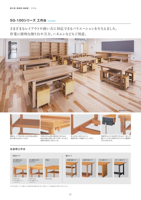 図工室・技術室・美術室|工作台SG-100シリーズ工作台〈受注生産品〉さまざまなレイアウトや使い方に対応できるバリエーションをそろえました。作業に便利な削り台や万力、ハネムシなどもご用意。港区立赤羽小学校様棚板は、ナラ材の枠に丈夫な9mm厚の板が組み込まれています。天板は27mm厚の集成材、削り台は40mm厚の合板で反りや狂いが少なく、長期の使用にも安心です。安心安全に使えるように強度を保った構造にしています。教師用および生徒用工作台の一部に付属している木工専用の万力です。2種類の万力があります。生徒用工作台天板タイプ脚タイプ木工用削り台なし木工万力×2木工用削り台付き木工万×2作業台4本脚中棚タイプ4本脚下棚タイプパネル脚タイプスチール脚タイプハネムシ×4※パネル脚タイプはハネムシ×2ハネムシ×4※パネル脚タイプはハネムシ×2ハネムシなし※万力は生産メーカーの都合により写真と異なる場合があります。仕様については担当者までお問い合わせください。87