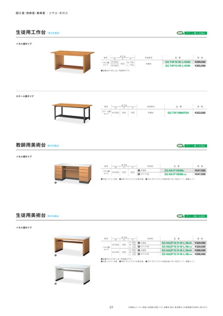 図工室・技術室・美術室|工作台・美術台生徒用工作台〈受注生産品〉パネル脚タイプスチール脚タイプ教師用美術台〈受注生産品〉パネル脚タイプ❶生徒用美術台〈受注生産品〉パネル脚タイプ❶❷グリーン購入法適合形状パネル脚タイプWW1800W1500外寸法D900HM:760L:700●品番内の(M・L)は、天板高さです。本体形状作業台品番SG-T4F18(M¿L)KNNSG-T4F15(M¿L)KNN価格¥299,000¥285,000形状スチール脚タイプ外寸法DWHW1800900760本体形状作業台品番価格SG-T5F18MKF5N¥252,000グリーン購入法適合形状パネル脚タイプ外寸法DWHW1800900800❶木目色❷ホワイト色本体色品番SG-NA1F18HMWSG-NA1F18HMPAW価格¥547,000¥547,000●天板/メラミン天板●本体/ポリエステル化粧合板●巾木/ポリエステル化粧合板t18ABSコーナー樹脂エッジグリーン購入法適合形状外寸法DWパネル脚タイプW1800900W1500900HH:800M:760L:700H:800M:760L:700❶木目色❷ホワイト色❸木目色❹ホワイト色本体色品番SG-NA2F18(H¿M¿L)MWNSG-NA2F18(H¿M¿L)MPAWSG-NA2F15(H¿M¿L)MWNSG-NA2F15(H¿M¿L)MPAW価格¥320,000¥320,000¥296,000¥296,000●品番内の(H・M・L)は、天板高さです。●天板/メラミン天板●本体/ポリエステル化粧合板●巾木/ポリエステル化粧合板t18ABSコーナー樹脂エッジ89※価格はメーカー希望小売価格(税抜)です。消費税、組立・配送費などの諸経費を別途申し受けます。