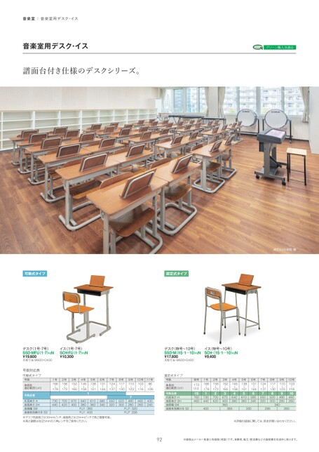 グリーン購入法適合港区SU小学校様イス(特号〜10号)SCH-(1S¿1〜10)F2N¥9,40010号10316〜19号11023〜18号11730〜17号12437〜16号13144〜15号13851〜14号14558〜13号15265〜12号15672〜11号16679〜117304404002700420367040036046403805610360658034075503208520300949028010460260340365330295260※詳細の図面に関しては、別途お問い合わせください。音楽室|音楽室用デスク・イス音楽室用デスク・イス譜面台付き仕様のデスクシリーズ。可動式タイプ固定式タイプデスク(特号〜10号)SSD-M(1S¿1〜10)F2N¥17,800天板寸法/W600×D400固定式タイプ号数身長別適応範囲(cm)号数品番机面高さH座面高さSH座面幅SW座面有効奥行きSD特号173以上1S76046011号9609〜110号10316〜19号11023〜18号11730〜17号12437〜16号13144〜15号13851〜14号14558〜13号15265〜12号15672〜11号16679〜17304407004206704001610360640380FU1:360FU1:4005803405503205203007490280FU7:320FU7:295460260430240号数対応表可動式タイプ号数身長別適応範囲(cm)号数品番机面高さH座面高さSH座面幅SW座面有効奥行きSD※デスク机面高さは30mmピッチ、座面高さは20mmピッチで高さ調整可能。※高さ調節は対辺5mmの六角レンチをご使用ください。デスク(1号・7号)SSD-MFU(1¿7)F2N¥19,600天板寸法/W600×D400イス(1号・7号)SCH-FU(1¿7)F2N¥10,30092※価格はメーカー希望小売価格(税抜)です。消費税、組立・配送費などの諸経費を別途申し受けます。