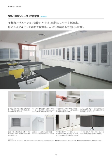 特別教室|収納家具SG-100シリーズ収納家具〈受注生産品〉多様なバリエーションと使いやすさ、収納のしやすさを追求。低ホルムアルデヒド素材を使用し、人にも環境にもやさしい仕様。双方向からの使いやすさに配慮した取っ手形状です。掘り込み型は足元の安全性を重視しています。ハンドル型は手の掛けやすさを重視しています。収納家具の中段以上にはハンドル型取っ手を採用しています。引き出しは、そのまま取り出せるトレー方式もあります。トレーを取り出せるので洗浄も容易に行えます。ダンパーや戸当たりをプラスすることで扉の開閉作業が静かに行えるなど、安全性と品質を向上しました。上段・中段の開き扉には耐震ラッチを標準装備しており、地震発生時に扉の開放を防ぎます。上段ユニットには天井までを収めるアジャスター付きのH3000タイプもあります。引き違い扉の下レールはアルミレールを採用しています。段差が少ないので、ほこりなどを掃き出しやすくなっています。ベースにはアジャスターが付いているので、床の不陸にも容易に対応できます。〈共通仕様〉天板/ダップシート、ポストフォーム本体/メラミン化粧板ノンスチレンポリエステル合板、ガラス:強化ガラス●棚可動式(ピッチ60mm)●アジャスター付き●安全のため必ず床固定、壁固定、横連結を行ってください。95
