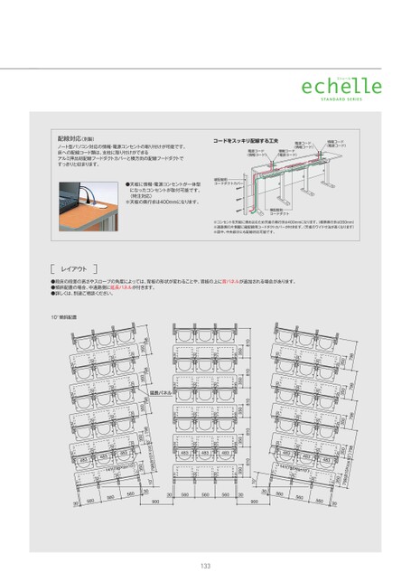 STANDARDSERIES情報コード(電源コード)配線対応(別製)ノート型パソコン対応の情報・電源コンセントの取り付けが可能です。床への配線コード類は、支柱に取り付けができるアルミ押出材配線フードダクトカバーと横方向の配線フードダクトですっきりと収まります。●天板に情報・電源コンセントが一体型になったコンセントが取付可能です。(特注対応)※天板の奥行きは400mmになります。電源コード(情報コード)情報コード(電源コード)コードをスッキリ配線する工夫電源コード(情報コード)縦配線用コードダクトカバー横配線用コードダクト※コンセントを天板に埋め込むため天板の奥行きは400mmになります。(標準奥行きは350mm)※コンセントを天板に埋め込むため天板の奥行きは400mmになります。標準奥行きは350mm)※通路側の片側脚に縦配線用コードダクトカバーが付きます。(天板のワイド寸法が長くなります)※通路側の片側脚に縦配線用コードダクトカバーが付きます。(天板のワイド寸法が長くなります)※図中、中央部分にも配線対応可能です。※図中、中央部分にも配線対応可能です。レイアウト●段床の段差の高さやスロープの角度によっては、背板の形状が変わることや、背板の上に背パネルが追加される場合があります。●傾斜配置の場合、中通路側に延長パネルが付きます。●詳しくは、別途ご相談ください。10°傾斜配置483483141(798×tan10°)810810810810810350350350350350483483483897053897053897053897延長パネル0°)0533056010°9003056056056030133798350798350798350798350798(810×cos10°)3504835605603018(8971so0×c10°039008433843840°)8×tna1053(7914106506565003