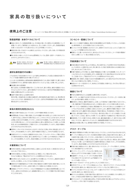 家具の取り扱いについて使用上のご注意ホームページに「商品に関する大切なお知らせ」を掲載しています。あわせてごらんください。https://www.kokuyo-furniture.co.jp/)取扱説明書・本体ラベルについてコンセント・配線について●商品に添付している取扱説明書には、その商品の使い方と使用上の注意事項について記載しています。ご使用前によくお読みの上、正しくお使いください。また、取扱説明書はお使いになる方がいつでも見られるところに必ず保管してください。●商品本体に貼ってあるラベルは絶対にはがさないでください。誤った使い方や事故を防止するためのものです。●特に安全にお使いいただくための必要事項については、警告・注意マークを表示していますので、必ずお守りください。警告取り扱いを誤ると、死亡または重傷を負う可能性があります注意取り扱いを誤ると、軽傷を負うかまたは、物的損害が発生する可能性があります適切な換気励行のお願い(下はJOIFA:「VOC対策ガイドライン」より抜粋。参考資料としては国土交通省住宅局パンフレット「快適で健康的な住宅で暮らすために」)ここに述べる注意事項は、使用者皆様の健康阻害を防ぐため、極めて重要です。購入以後のご注意事項ですから、使用者の皆様に是非お守りいただくよう宜しくお願い申し上げます。●商品購入時の注意事項購入当初は、化学物質の発散が多いことがあります。暫くの間は、換気や通風を十分に行うよう心がけてください。室内の換気が十分行われないと室内化学物質濃度が高まり、健康に影響を及ぼすことがあります。●温度や湿度の変化による換気の励行室内が著しく高温多湿となる場合(温度28℃、相対湿度50%超が目安)には、窓を閉め切らないようにするか、強制換気を行ってください。室内化学物質濃度が高まり、健康に影響を及ぼすことがあります。家具の異常を発見されたら●商品の分解や改造はしないでください。けがや破損の原因になります。●使用開始後、引き出しや棚に収納したものの重量や床の状態により、本体にゆがみがでて、扉や引き出しと本体のすき間が目立ったり、こすれたりすることがあります。そのときは再度、本体の水平を調節してください。本体の水平を調節しても、扉や引き出しと本体とのすき間が直らない、こすれたままの場合は、直ちに使用を中止してお買い上げの販売店、またはお客様相談室にご相談ください。そのまま使用していますと、商品の破損によりけがをするおそれがあります。●使用中に、ボルトやネジのゆるみによるがたつきが生じた時は、早めに締め直しを行ってください。そのまま使用していますと、変形や破損を引き起こし、けがをする原因になります。●溶接外れやリベットゆるみ、接着部のゆるみ、外れ、アジャスターやキャップ類の欠落などの異常を発見された時は、直ちに使用を中止して、お買い上げの販売店にご相談ください。そのまま使用していますと、商品の破損によりけがをするおそれがあります。木製家具について●天然木を使用した商品は材料の特性上、個体による木目・色合いに差異があります。あらかじめご了承ください。●天然木を使用した天板は、木目の凹凸により筆記しづらい場合があります。そのような場合は、下敷き付きデスクマットの使用をおすすめします。●飲み物をこぼしたままにしたり、ぬれ雑巾などを放置しないでください。表面材の変色やはがれ、ひび割れ、ふくれ、そりなどの原因になります。●直射日光や冷暖房器具などでの熱・冷気が直接あたる場所や湿気・乾燥の著しいところでの使用は避けてください。変色や変形、そり・目割れなどの原因になります。●塗装面にプラスチックやビニールなどの樹脂製品やゴム製品を長期間放置しないでください。塗料との化学反応により、接触面が軟化したり、ベトツキ現象や色の移行を起こすことがあります。139●コンセントに接続する機器は、規定の定格消費電力以内で使用してください。これを超えると異常発熱して、火災の原因になることがあります。●コンセントや灯具・配線部に水がかかったり、異物やごみが入らないようにご注意ください。ショートや感電のおそれがあります。●配線コードに重いものをのせたり、挟み込んだりしないでください。コード内部の電線が切れて、感電・ショート・発火の原因になります。天板表面について●天板を構成する材料や仕上げの特性上、同じ色柄であっても照明や方向や見る角度によっては色合いに差異が生じます。特に隣り合った天板で差異が認められる場合があります。あらかじめご了承ください。●木製や塗装仕上げの天板には、金属や陶磁器などの硬いものを直接置いたり、ボールペンなど先のとがったものを使用しますと、表面を傷つけたり跡が残るおそれがありますので、ご注意ください。下敷き付きデスクマットの使用をおすすめします。●塗装面に熱い湯呑み、高温となるものを直接