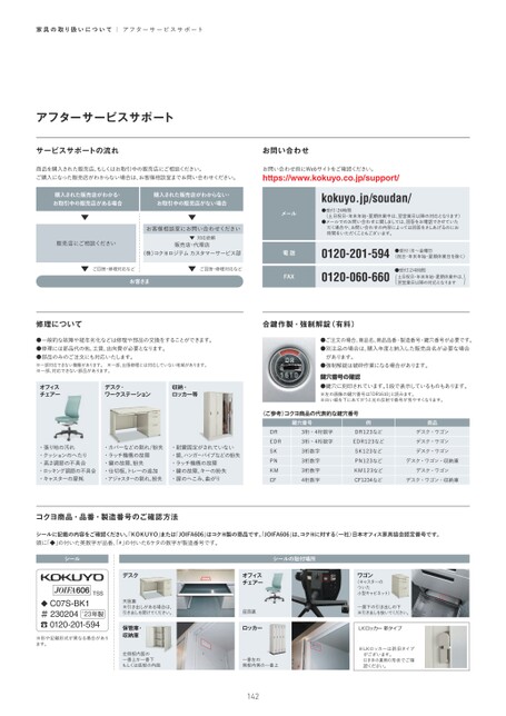 家具の取り扱いについて|アフターサービスサポートアフターサービスサポートサービスサポートの流れお問い合わせ商品を購入された販売店、もしくはお取引中の販売店にご相談ください。ご購入になった販売店がわからない場合は、お客様相談室までお問い合わせください。お問い合わせ前にWebサイトをご確認ください。https://www.kokuyo.co.jp/support/購入された販売店がわかる・お取引中の販売店がある場合購入された販売店がわからない・お取引中の販売店がない場合お客様相談室にお問い合わせください販売店にご相談ください対応依頼販売店・代理店(株)コクヨロジテムカスタマーサービス部ご回答・修理対応などご回答・修理対応などお客さまメール電話FAXkokuyo.jp/soudan/●受付:24時間(土日祝日・年末年始・夏期休業中は、翌営業日以降の対応となります)●メールでのお問い合わせに関しましては、回答をお電話でさせていただく場合や、お問い合わせの内容によっては回答をさしあげるのにお時間をいただくこともございます。0120-201-594●受付:月~金曜日(祝日・年末年始・夏期休業日を除く)0120-060-660●受付:24時間(土日祝日・年末年始・夏期休業中は、)翌営業日以降の対応となります修理について合鍵作製・強制解錠(有料)●一般的な故障や経年劣化などは修理や部品の交換をすることができます。●修理には部品代の他、工賃、出向費が必要となります。●部品のみのご注文にも対応いたします。※一部対応できない機種があります。※一部、出張修理には対応していない地域があります。※一部、対応できない部品があります。オフィスチェアーデスク・ワークステーション収納・ロッカー等・張り地の汚れ・クッションのへたり・高さ調節の不具合・ロッキング調節の不具合・キャスターの摩耗・カバーなどの割れ/紛失・ラッチ機構の故障・鍵の故障、紛失・仕切板、トレーの追加・アジャスターの割れ、紛失・耐震固定がされていない・鏡、ハンガーパイプなどの紛失・ラッチ機構の故障・鍵の故障、キーの紛失・扉のへこみ、曲がり●ご注文の場合、商品名、商品品番・製造番号・鍵穴番号が必要です。●別注品の場合は、購入年度と納入した販売店名が必要な場合があります。●強制解錠は破砕作業になる場合があります。鍵穴番号の確認●鍵穴に刻印されています。1段で表示しているものもあります。※左の画像の鍵穴番号は「DR1610」と読みます。※白い紙を下にあてがうと光の反射で番号が見やすくなります。(ご参考)コクヨ商品の代表的な鍵穴番号鍵穴番号3桁・4桁数字3桁・4桁数字3桁数字3桁数字3桁数字4桁数字DREDRSKPNKMCF例DR123などEDR123などSK123などPN123などKM123などCF1234など商品デスク・ワゴンデスク・ワゴンデスク・ワゴンデスク・ワゴン・収納庫デスク・ワゴンデスク・ワゴン・収納庫コクヨ商品・品番・製造番号のご確認方法シールに記載の内容をご確認ください。KOKUYO」または「JOIFA606」はコクヨ製の商品です。JOIFA606」は、コクヨに対する(一社)日本オフィス家具協会認定番号です。頭に「◆」の付いた英数字が品番、#」の付いた6ケタの数字が製造番号です。シールシールの貼付場所606TSS◆C07S-BK1#230204'23年製0120-201-594※形や記載形式が異なる場合があります。デスク天板裏※引き出しがある場合は、引き出しを開けてください。保管庫・収納庫左側板内面の一番上か一番下もしくは底板の内面オフィスチェアー座面裏ロッカー一番左の側板内側の一番上142ワゴン(キャスターのついた小型キャビネット)一番下の引き出しの下※引き出しを抜いてください。LKロッカー新タイプ※LKロッカーは新旧タイプがございます。引き手の裏側の形状でご確認ください。