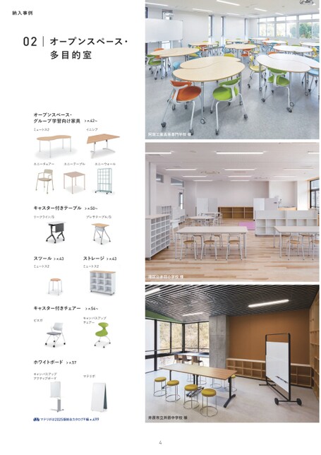 納入事例02オープンスペース・多目的室オープンスペース・グループ学習向け家具ミュートス2P.42〜イニシア阿南工業高等専門学校様エニーチェアーエニーテーブルエニーウォールキャスター付きテーブルP.50〜リーフライン/Sプレサテーブル/Sスツールミュートス2P.43ストレージP.43ミュートス2港区立赤羽小学校様キャスター付きチェアーP.54〜ピエガキャンパスアップチェアーホワイトボードP.57キャンパスアップアクティブボードマテリボßマテリボは2025版総合カタログF編P.499井原市立井原中学校様4