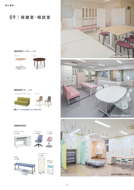納入事例09保健室・相談室相談室用テーブルP.137ジュートフランカ山形市立南沼原小学校様相談室用イスP.137イートインシリーズ〈ソファー〉ミケットßミケットは2025版総合カタログF編P.205〜保健室用家具iSデスクシステムP.114ピコラリビナP.120ココットP.137診察台P.137クロススクリーンP.137脱衣カゴP.137東京都北区立飛鳥中学校様板橋区立板橋第十小学校様13