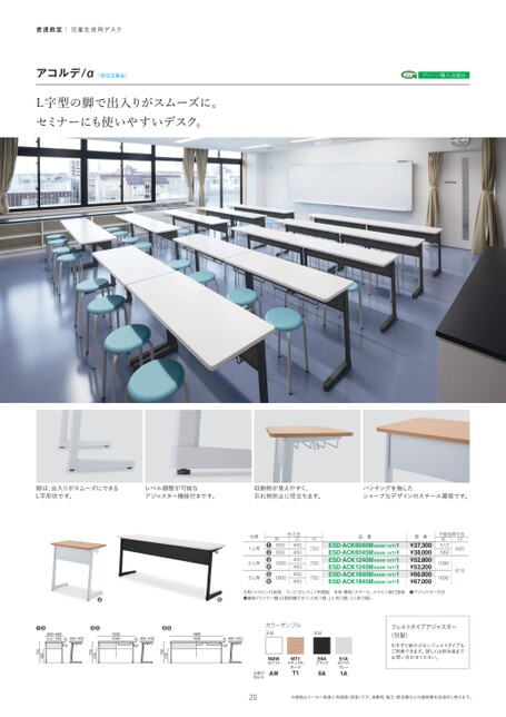 普通教室|児童生徒用デスクアコルデ/α〈受注生産品〉L字型の脚で出入りがスムーズに。セミナーにも使いやすいデスク。グリーン購入法適合脚は、出入りがスムーズにできるL字形状です。レベル調整が可能なアジャスター機能付きです。収納物が見えやすく、忘れ物防止に役立ちます。パンチングを施したシャープなデザインのスチール幕板です。品番価格下肢空間寸法ESD-ACK6040M6AAW¿1AT11ESD-ACK6545M6AAW¿1AT11ESD-ACK1240M6AAW¿1AT11ESD-ACK1245M6AAW¿1AT11ESD-ACK1840M6AAW¿1AT11ESD-ACK1845M6AAW¿1AT11¥37,300¥38,000¥52,800¥53,200¥66,800¥67,000H620615W51256210901690天板/メラミン化粧板エッジ:オレフィン系樹脂本体・幕板/スチール、メラミン焼付塗装●アジャスター付き●棚板(ワイヤー棚)は個別棚です(1人用:1個、2人用:2個、3人用:3個)。仕様1人用2人用3人用W60065012001800❶❷❸❹❺❻外寸法D400450400450400450H720720720カラーサンプル天板本体MT1ナチュラルオークT1E6Aブラック6AE1Aホワイトグレー1AMAWホワイト品番内色記号AW20フェルトタイプアジャスター(別製)引きずり音の少ないフェルトタイプもご用意できます。詳しくは担当者までお問い合わせください。※価格はメーカー希望小売価格(税抜)です。消費税、組立・配送費などの諸経費を別途申し受けます。❻400・450202518001690❺❻478720400・450252012001090❷❸❹478720400・4502010600・650512・562❷❶482720SSD-ACX1SASSD-ACX1SBSSD-ACX2SASSD-ACX2SBSSD-ACX3SASSD-ACX3SB