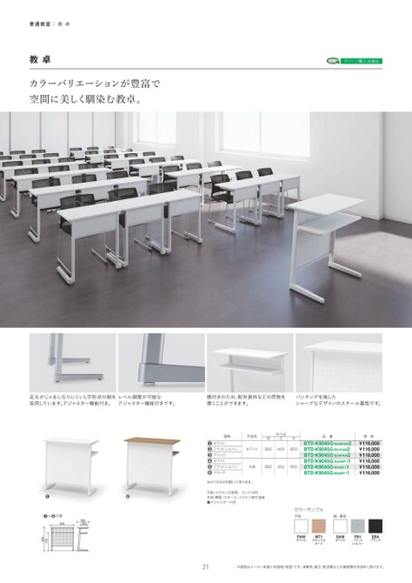 普通教室|教卓教卓カラーバリエーションが豊富で空間に美しく馴染む教卓。グリーン購入法適合足元がじゃまになりにくいL字形状の脚を採用しています。アジャスター機能付き。レベル調整が可能なアジャスター機能付きです。棚付きのため、配布資料などの荷物を置くことができます。パンチングを施したシャープなデザインのスチール幕板です。脚色天板色外寸法DWH❶ホワイト❷フラットシルバー❸ブラック❹ホワイト❺フラットシルバー❻ブラックホワイト900450900木目900450900品番BTD-K9045G-SAWPAW2BTD-K9045G-P81PAW2BTD-K9045G-E6APAW2BTD-K9045G-SAWMT11BTD-K9045G-P81MT11BTD-K9045G-E6AMT11価格¥116,000¥116,000¥116,000¥116,000¥116,000¥116,000※H1050は別製にて承ります。天板/メラミン化粧板エッジ:ABS本体・幕板/スチール、メラミン焼付塗装●アジャスター付きカラーサンプル天板脚・幕板PAWホワイトMT1ナチュラルオークSAWホワイトP81フラットシルバーE6Aブラック21※価格はメーカー希望小売価格(税抜)です。消費税、組立・配送費などの諸経費を別途申し受けます。●●❶〜❻共通900450280700900