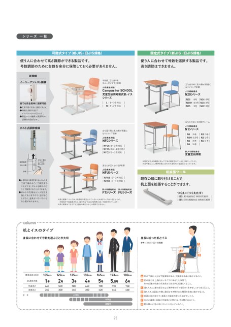 シリーズ一覧可動式タイプ(新JIS・旧JIS規格)固定式タイプ(新JIS・旧JIS規格)使う人に合わせて高さ調節ができる製品です。号数調節のために台数を余分に保管しておく必要がありません。使う人に合わせて号数を選択する製品です。高さ調節はできません。立ち座り時に机の脚が邪魔になりにくいT字脚JIS規格適合N20シリーズN26N25HN25:6号:5.5号:5号N24N23N22:4号:3号:2号足もとの広い4本脚フレームJIS規格適合N1シリーズN6N5HN5N4:6号:5.5号:5号:4号N3N2N1:3号:2号:1号旧JIS規格適合児童生徒用机※固定式で、JIS規格に従って寸法が設定されています(JISマーク入り)。※各号数ごとに、標準身長に合わせた適切な寸法設定になっています。机拡張ツール既存の机に取り付けることで机上面を拡張することができます。つくえ+(つくえたす)65S:JIS規格対応W650天板用60S:旧JIS規格対応W600天板用身長に合った机とイス参考:JISS1021付属書BCDAEFG机の下部に十分な下肢領域があり、大腿部を自由に動かせること。机の高さは、上腕をまっすぐ下に伸ばした状態で、肘の位置が机面の先端高さとほぼ同じ位置にくること。背もたれは、腰の部分および肩甲骨の下の部分で、背中をしっかり支えること。背もたれと座面との間に適切なすき間があり、臀部を自由に動かせること。座面の前の部分で、座面と大腿部の間に圧迫がないこと。ひざの裏側と座面の先端部との間には、すき間があること。靴を履いた足が床にぴったり付いていること。ABCDEFG新機構イージーアジャスト機構誰でも安全簡単に調節可能●工具不要で安全に調節できます。●確実な操作を促すインジケーター付きです。●安全ロック機構で調節時の誤操作を防ぎます。ボルト式調節機構ボルト頭にしっかり差し込む固定金具ボルト頭支柱●片側1本(両側2本)のボルトを工具で緩めることで調節することができ、ボルトを締めこむことで固定することができます。●ボルトの先端はカシメ加工を施してありますので、抜けることがなく、金具がバラバラになる心配がありません。可動性、立ち座りをスムーズにするY字脚JIS規格対応CampusforSCHOOL児童生徒用可動式机・イスシリーズL:6〜3号対応M:5〜2号対応立ち座り時に机の脚が邪魔になりにくいT字脚JIS規格対応NFCシリーズNFC6:6〜3号対応NFC5:5.5〜2号対応NFC3:3〜1号対応足もとが広くとれるU字脚JIS規格対応NFUシリーズNFU6:6〜3号対応NFU3:3〜1号対応旧JIS規格対応FTシリーズ旧JIS規格対応FUシリーズ※高さ調節については、JIS規格で規定されていないためJISマークはつきませんが、天板高さや座面高さなど、基本的な寸法はJIS規格に従って設定されています。※高さ調節はできますが、座面の奥行きなどは調節できません。column机とイスのタイプ身長に合わせて号数を選ぶことが大切標準身長(参考)105cm120cm135cm150cm165cmJIS規格号数机面高さ座面高さ学年1号4602602号5203004号6403805号7004203号580340小学生173cm5.5号730440180cm6号760460中学生高校生25