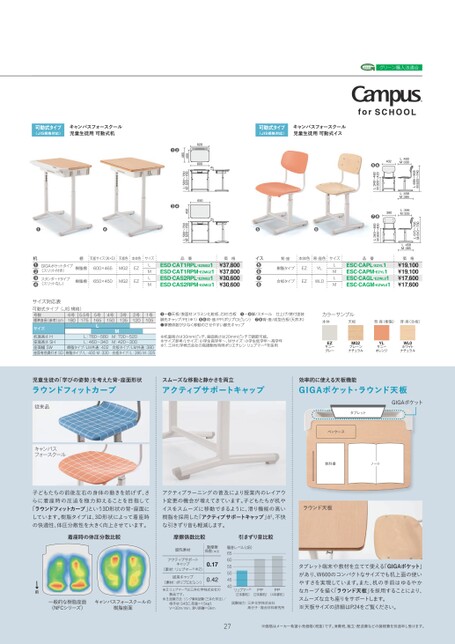 グリーン購入法適合20〜40〜00〜0〜4000402420❺❻00〜42040〜40❼❽00〜42040〜40可動式タイプ(JIS規格対応)キャンパスフォースクール児童生徒用可動式机可動式タイプ(JIS規格対応)キャンパスフォースクール児童生徒用可動式イス❺❽20004004:20〜00:0〜040:20〜00:0〜0❷❶❸❹❶❹価格¥19,100¥19,100¥17,600¥17,6004本体色背・座色サイズ品番EZEZYLWL0LMLMESC-CAPL-EZYL1ESC-CAPM-EZYL1ESC-CAGL-EZWL01ESC-CAGM-EZWL01机❶❷❸❹GIGAポケットタイプ(スリット付き)スタンダードタイプ(スリットなし)棚天板サイズ(W×D)天板色本体色サイズ品番樹脂棚600×465MG2EZ樹脂棚650×450MG2EZLMLMESD-CAT1RPL-EZMG21ESD-CAT1RPM-EZMG21ESD-CAS2RPL-EZMG21ESD-CAS2RPM-EZMG21価格¥37,800¥37,800¥30,600¥30,600樹脂タイプイス背・座❺❻❼❽合板タイプ4号1503号1352号1201号105❶~❹天板/表面材:メラミン化粧板、芯材:合板❶〜❽脚/スチール仕上げ/焼付塗装脚先キャップ/PE※1)❺❻背・座/PPポリプロピレン)❼❽背・座/成型合板(天然木)●摩擦係数が少なく移動のさせやすい脚先キャップカラーサンプル本体天板背・座(樹脂)背・座(合板)サイズ対応表可動式タイプ(JIS規格)号数標準身長(参考)cm6号1805.5号1755号165Lサイズ机面高さH座面高さSH座面幅SW座面有効奥行きSDML:760〜580M:700〜520L:460〜340M:420〜300樹脂タイプ/LM共通:402合板タイプ/LM共通:380樹脂タイプ/L:400M:330合板タイプ/L:395M:325※机面高さは30mmピッチ、座面高さは20mmピッチで調節可能。※サイズ参考/Lサイズ:小学生高学年〜、Mサイズ:小学生低学年〜高学年※1.三井化学株式会社の高摺動性特殊ポリエチレンリュブマー®を採用EZサニーグレーMG2プレーンナチュラルYLサニーオレンジWL0ホワイトナチュラル児童生徒の「学びの姿勢」を考えた背・座面形状ラウンドフィットカーブスムーズな移動と静かさを両立アクティブサポートキャップ効率的に使える天板機能GIGAポケット・ラウンド天板従来品キャンパスフォースクールGIGAポケットタブレットペンケース教科書ノート子どもたちの前後左右の身体の動きを妨げず、さらに着座時の圧迫を極力抑えることを目指して「ラウンドフィットカーブ」という3D形状の背・座面にしています。樹脂タイプは、3D形状によって着座時の快適性、体圧分散性を大きく向上させています。アクティブラーニングの普及により授業内のレイアウト変更の機会が増えてきています。子どもたちが机やイスをスムーズに移動できるように、滑り機能の高い樹脂を採用した「アクティブサポートキャップ」が、不快な引きずり音も軽減します。着座時の体圧分散比較摩擦係数比較引きずり音比較ラウンド天板前一般的な樹脂座面(NFCシリーズ)キャンパスフォースクールの樹脂座面※2.リュブマー®は三井化学株式会社の製品です。※3.試験方法:リング摩耗試験(三井化学法)/相手材S45C,荷重=15kgf,V=30m/min,滑り距離=3km騒音レベル(dB)656055504540リュブマー®(2本脚机)PPPP(2本脚机)(4本脚机)試験協力:三井化学株式会社高分子・複合材料研究所タブレット端末や教材を立てて使える「GIGAポケット」があり、W600のコンパクトなサイズでも机上面の使いやすさを実現しています。また、机の手前はゆるやかなカーブを描く「ラウンド天板」を採用することにより、スムーズな立ち座りをサポートします。※天板サイズの詳細はP.24をご覧ください。27※価格はメーカー希望小売価格(税抜)です。消費税、組立・配送費などの諸経費を別途申し受けます。