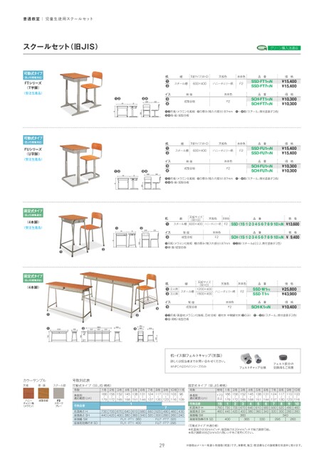 普通教室|児童生徒用スクールセットスクールセット(旧JIS)グリーン購入法適合机棚❶❷スチール棚天板サイズ(W×D)天板色本体色品番600×400ハニーチェリー柄F2イス背・座❸❹成型合板本体色F2❶❷天板/メラミン化粧板棚の厚み(物入れ部分)87mm❶〜❹脚/スチール、焼付塗装(F2色)❸❹背・座/成型合板SSD-FT1F2NSSD-FT7F2N品番SCH-FT1F2NSCH-FT7F2NSSD-FU1F2NSSD-FU7F2N品番SCH-FU1F2NSCH-FU7F2N価格¥15,400¥15,400価格¥10,300¥10,300価格¥15,400¥15,400価格¥10,300¥10,300机棚❶❷スチール棚天板サイズ(W×D)天板色本体色品番600×400ハニーチェリー柄F2イス背・座❸❹成型合板本体色F2❶❷天板/メラミン化粧板棚の厚み(物入れ部分)87mm❶〜❹脚/スチール、焼付塗装(F2色)❸❹背・座/成型合板机棚❶スチール棚天板サイズ(W×D)600×400天板色本体色ハニーチェリー柄F2品番SSD-(1S¿1¿2¿3¿4¿5¿6¿7¿8¿9¿10)F2N成型合板イス背・座❷❶天板/メラミン化粧板棚の厚み(物入れ部分)87mm❶❷脚/スチールφ22.2、焼付塗装(F2色)❷背・座/成型合板SCH-(1S¿1¿2¿3¿4¿5¿6¿7¿8¿9¿10)F2N本体色品番F2価格¥13,600価格¥9,400机棚❶2人用❷3人用スチール棚天板サイズ(W×D)1200×4001800×400天板色本体色品番ハニーチェリー柄F2イス背・座❸成型合板❸本体色F2SSD-W1F2SSD-T1F2品番SCH-K1F2N価格¥25,800¥43,900価格¥10,400❶❷天板/表面材:メラミン化粧板、芯材:合板棚付き中間脚付き(❷のみ)❶〜❸脚/スチール、焼付塗装(F2色)❸座・背板/成型合板机・イス脚フェルトキャップ(別製)詳しくは担当者までお問い合わせください。※NFC・N20・N1シリーズのみフェルトキャップ仕様フェルト部分の交換用もご用意SSD-FTSCH-FTSH❸❹SWSDWD❷❶HSSD-FUSCH-FUSH❸❹SWSDWD❷❶H❶WD❷SWSDSCHSHSSD-H❷❶可動式タイプ(旧JIS規格対応)FTシリーズ(T字脚)〈受注生産品〉可動式タイプ(旧JIS規格対応)FUシリーズ(U字脚)〈受注生産品〉固定式タイプ(旧JIS規格適合)(4本脚)〈受注生産品〉固定式タイプ(旧JIS規格対応)(4本脚)360400❷440SCH-K1400440SCH-K15221800522522400440360❸SSD-T1440❷20801007301200400SSD-W1❶❶73010号10316〜19号11023〜18号11730〜17号12437〜16号13144〜15号13851〜14号14558〜13号15265〜12号15672〜179〜1173以上固定式タイプ(旧JIS規格)1号166号数特号身長別適応範囲(cm)10号11号1039609〜116〜19号11023〜18号11730〜17号12437〜16号13144〜15号13851〜14号14558〜13号15265〜172〜179〜1号数対応表可動式タイプ(旧JIS規格)2号1561号166号数身長別適応範囲(cm)号数品番机面高さH座面高さSH座面幅SW座面有効奥行きSD1730440700420670400640380610360580340550320FU1・FT1:360FU1・FT1:4007490280460520300260FU7・FT7:320FU7・FT7:295号数品番机面高さH座面高さSH座面幅SW座面有効奥行きSD1S76046017304404004302402700420367040036046403805610360658034075503208520300949028010460260340365330295260〈可動式タイプ共通仕様〉※机面高さは30mmピッチ、座面高さは20mmピッチで高さ調節可能。※高さ調節は対辺5mmの六角レンチをご使用ください。29※価格はメーカー希望小売価格(税抜)です。消費税、組立・配送費などの諸経費を別途申し受けます。カラーサンプル天板背・座スチール部ハニーチェリー柄(メラミン)成型合板F2スモークグレー