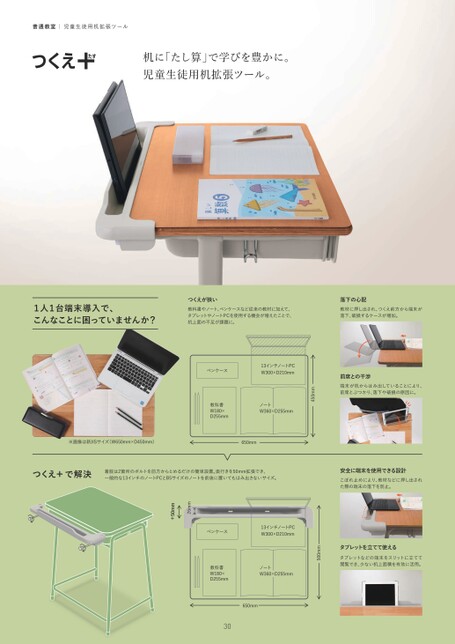 つくえが狭い教科書やノート、ペンケースなど従来の教材に加えて、タブレットやノートPCを使用する機会が増えたことで、机上面の不足が課題に。落下の心配教材に押し出され、つくえ前方から端末が落下、破損するケースが増加。前席との干渉端末が机からはみ出していることにより、前席とぶつかり、落下や破損の原因に。450mmペンケース13インチノートPCW300×D210mm教科書W180×D255mmノートW360×D255mmタブレットを立てて使えるタブレットなどの端末をスリットに立てて閲覧でき、少ない机上面積を有効に活用。500mmペンケース13インチノートPCW300×D210mm教科書W180×D255mmノートW360×D255mm650mm3026mm+50mm※画像は新JISサイズ(W650mm×D450mm)650mm着脱は2箇所のボルトを前方からとめるだけの簡単設置。奥行きを50mm拡張でき、一般的な13インチのノートPCとB5サイズのノートを前後に置いてもはみ出さないサイズ。安全に端末を使用できる設計こぼれ止めにより、教材などに押し出された際の端末の落下を防止。普通教室|児童生徒用机拡張ツール机に「たし算」で学びを豊かに。児童生徒用机拡張ツール。