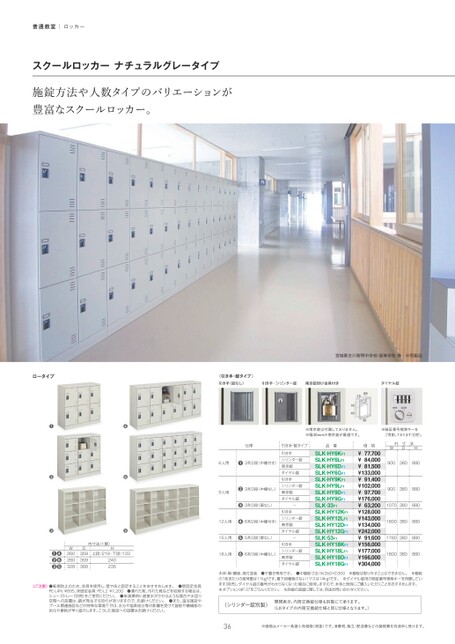 普通教室|ロッカースクールロッカーナチュラルグレータイプ施錠方法や人数タイプのバリエーションが豊富なスクールロッカー。ロータイプ〈引き手・錠タイプ〉引き手(錠なし)引き手・シリンダー錠南京錠掛け金具付きダイヤル錠宮城県古川黎明中学校・高等学校様※別製品φ515184030※南京錠は付属しておりません。※幅30mmの南京錠が最適です。※暗証番号検索キーをご用意しております(別売)。仕様引き手・錠タイプ品番価格❶❷❸❹❻❺W260260328D359359368❶❹❷❻❸❺内寸法(1扉)H上段/219・下段/133240235〈ご注意〉●転倒防止のため、金具を使用し、壁や床と固定することをおすすめします。●壁固定金具PE-L4N¥895、床固定金具PE-L2¥1,200●濡れた靴、汚れた靴などを収納する場合は、シューズトレー(別売)をご使用ください。●床清掃時に直接水がかかるような場合や水回り空間への設置は、錆が発生する恐れがありますので、お避けください。●また、温浴施設やプール関連施設などの特殊な環境下では、水分や塩素成分等の影響を受けて錠前や機構部の劣化や摩耗が早く進行します。こうした施設への設置はお避けください。6人用❶3列2段(中棚付き)9人用❷3列3段(中棚なし)❸3列3段(扉なし)12人用❹6列2段(中棚付き)15人用❺5列3段(扉なし)18人用❻6列3段(中棚なし)引き手シリンダー錠南京錠ダイヤル錠引き手シリンダー錠南京錠ダイヤル錠-引き手シリンダー錠南京錠ダイヤル錠-引き手シリンダー錠南京錠ダイヤル錠外寸法DHW9003808809003808801070380880180038088017603808801800380880SLK-HY6KF1SLK-HY6LF1SLK-HY6DF1SLK-HY6GF1SLK-HY9KF1SLK-HY9LF1SLK-HY9DF1SLK-HY9GF1SLK-33F1SLK-HY12KF1SLK-HY12LF1SLK-HY12DF1SLK-HY12GF1SLK-53F1SLK-HY18KF1SLK-HY18LF1SLK-HY18DF1SLK-HY18GF177,700¥¥84,00081,500¥¥133,000¥91,400¥102,00097,700¥¥176,000¥63,200¥128,000¥143,000¥134,000¥242,000¥91,600¥156,000¥177,000¥166,000¥304,000本体・扉/鋼板、焼付塗装●下置き専用です。●中棚板寸法/W260×D300※棚板は取り外すことはできません。※棚板の1枚あたりの耐荷重は11kgfです。最下段棚板のない1マスは14kgfです。※ダイヤル錠用の暗証番号検索キーを用意しています(別売)。ダイヤル錠の番号がわからなくなった場合に使用しますので、本体と同時にご購入いただくことをおすすめします。※オプションはP.37をごらんください。※詳細の図面に関しては、別途お問い合わせください。(シリンダー錠別製)開閉表示、内筒交換錠仕様も別製にて承ります。(LKタイプの内筒交換錠仕様と同じ仕様となります。)36※価格はメーカー希望小売価格(税抜)です。消費税、組立・配送費などの諸経費を別途申し受けます。