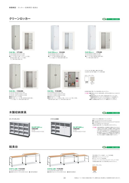 普通教室|ロッカー・収納家具・給食台クリーンロッカーグリーン購入法適合CLK-35F1¥77,500外寸法/W455×D515×H1790内寸法/W395×D310×H1635●トレー(大1個、小1個)、バスケット(小2個)、雑巾掛け金具(1個)、フック(6個)、モップ掛け金具(6個)付きCLK-Z35SAW¿F1¥53,200外寸法/W455×D515×H1790内寸法/W395×D490×H1635●トレー(大1個)、雑巾掛け金具(3個)、フック(6個)、モップ掛け金具(6個)付きCLK-50SAW¿F1¥79,300外寸法/W500×D380×H1790内寸法/W440×D355×H1635●トレー(大1個)、雑巾掛け金具(2個)、モップ掛け金具(5個)付き〈F1色〉本体・扉・棚板/鋼板、焼付塗装〈SAW色〉本体・扉/鋼板、メラミン焼付塗装カラーサンプルSAWホワイトF1ナチュラルグレーCLK-45F1¥102,000外寸法/W700×D515×H1790内寸法(右)/W392×D465×H1635内寸法(左)/W212×D465×H1635●棚板24mmピッチで可動●棚板(4枚)、トレー(大1個)、雑巾掛け金具(6個)、フック(2個)、モップ掛け金具(6個)付きCLK-65F1¥123,000外寸法/W880×D515×H1790内寸法(右)/W392×D335×H1645内寸法(左)/W392×D365×H1645●棚板24mmピッチで可動●棚板(4枚)、トレー(大2個、小1個)、バスケット(大1個、小2個)、雑巾掛け金具(3個)、モップ掛け金具(5個)付き※詳細の図面に関しては、別途お問い合わせください。〈ご注意〉●転倒防止のため、金具を使用し、壁や床と固定することをおすすめします。●●壁固定金具PE-L4N¥895、床固定金具PE-L2¥1,200、横連結用金具セットLKV-1¥170(ボルト・ナット各4個入り)、連結穴用キャップLKC-1¥110穴埋めキャップ4個入り)扉には扉開放状態でのストッパー機構は付いていません。木製収納家具オープンボックスクズ入れ収納SG-WF1681PAW¥260,000外寸法/W1600×D450×H1000SG-WF1682PAW¥298,000外寸法/W1600×D450×H1000給食台S-KT1P16NN¥123,000外寸法/W1920×D498×H600●収納時寸法/W1170×D498×H600●片側天板伸縮式S-KT2P16NN¥135,000外寸法/W2790×D498×H600●収納時寸法/W1270×D498×H600●両側天板伸縮式グリーン購入法適合本体/メラミン両面化粧パーティクルボード●ボックス内寸法/W375×D415×H266●ゴミ箱収納寸法/W375×D414×H620SG-WF1682のみ)●クズ入れ別売(SG-WF1682のみ)※詳細の図面に関しては、別途お問い合わせください。〈ご注意〉木製収納家具は、床清掃時に直接水がかかるような場合や水回り空間への設置は、腐食や金具部に錆が発生する恐れがありますので、お避けください。また、温浴施設やプール関連施設などの特殊な環境下では、水分や塩素成分等の影響を受けて錠前や機構部の劣化や摩耗が早く進行します。こうした施設への設置はお避けください。グリーン購入法適合天板/表面:メラミン化粧板エッジ:ABS樹脂構造:枠組フラッシュ、ペーパーコア脚/スチールパイプ、粉体塗装キャスター/ハード(ナイロン)キャスター(ストッパー付き)※詳細の図面に関しては、別途お問い合わせください。カラーサンプルP16ナチュラル38※価格はメーカー希望小売価格(税抜)です。消費税、組立・配送費などの諸経費を別途申し受けます。