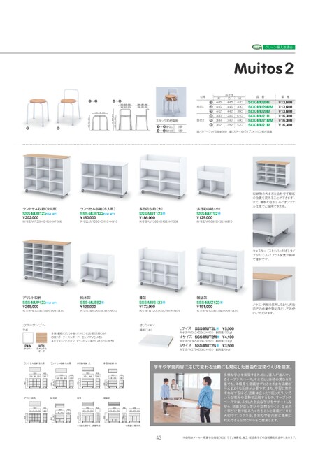 グリーン購入法適合仕様背なし背付きW448445442390388382❶❷❸❹❺❻外寸法D448445442385382382H420400380610590570座/ラバーウッド合板φ300脚/スチールパイプ、メラミン焼付塗装品番SCK-MU20HSCK-MU20MMSCK-MU20MSCK-MU21HSCK-MU21MMSCK-MU21M価格¥13,600¥13,600¥13,600¥16,300¥16,300¥16,300スタック可能脚数❶〜❸背なし❹〜❻背付き8脚4脚❹〜❻390¿388¿382322¿320¿320385¿382¿382358¿355¿350420¿400¿380610¿590¿570❶〜❸448¿445¿442420¿400¿380SCK-MU20H¿20MM¿20MSCK-MU21H¿21MM¿21M❷❺ランドセル収納(9人用)SSS-MUR123PAW・MT1¥202,000外寸法/W1200×D450×H1005ランドセル収納(6人用)SSS-MUR122PAW・MT1¥150,000外寸法/W1200×D450×H810多目的収納(大)SSS-MUT123Ω¥186,000外寸法/W1200×D435×H1005多目的収納(小)SSS-MUT92Ω¥125,000外寸法/W908×D435×H810収納物の大きさに合わせて棚板の位置を変えることができます。また、棚板を追加するとオリジナル仕様でご使用できます。キャスター(ストッパー付き)タイプなので、レイアウト変更が簡単で便利です。プリント収納SSS-MUP123PAW・MT1¥265,000外寸法/W1200×D450×H1005絵本架SSS-MUE92Ω¥126,000外寸法/W908×D435×H810書架SSS-MUS123Ω¥173,000外寸法/W1200×D435×H1005雑誌架SSS-MUZ123Ω¥191,000外寸法/W1200×D435×H1005メラミン天板を採用しており、天板面での作業や筆記面としてお使いいただけます。カラーサンプル天板本体・棚板/プリント紙・メラミン化粧板(天板のみ)芯材/パーティクルボードエッジ/PVC、ABSキャスター/ナイロン、エラストマー巻き(ストッパー付き)オプション棚板(1枚)PAWホワイトMT1ナチュラルオーク外寸法/W562×D362×H20耐荷重/15kgfLサイズSSS-MUT2LΩ¥5,500MサイズSSS-MUT2MΩ¥4,100SサイズSSS-MUT2SΩ¥3,500外寸法/W365×D362×H20耐荷重/10kgf外寸法/W270×D362×H20耐荷重/6kgf多様な学びを実現するために、導入が進んでいるオープンスペース。そこでは、体格の異なる児童でも、体格差を意識せずにさまざまな活動が行えるような配慮が必要です。また、学習に集中すればするほど、児童は立ったり座ったり、いろいろな場所や姿勢で活動するもの。オープンスペースでは、こうした自由な学びをサポートしながら、児童が自ら学びの空間をつくり、自主的に学びに取り組みたくなるような環境づくりが大切です。コクヨは、多彩な学習内容に柔軟に対応できる空間づくりをご提案します。43※価格はメーカー希望小売価格(税抜)です。消費税、組立・配送費などの諸経費を別途申し受けます。※両面仕様です。表裏共通)※両面仕様です。1200435120043512003703703703703703703703703702721005205365810雑誌架12005655654353609084184184353623122702701005書架31027227210051200365365365450360120036536536545036233233281027827827810053623188101200270270270270450362908418418435362121812812181281005プリント収納絵本架ランドセル収納9人用ランドセル収納6人用多目的収納大多目的収納小