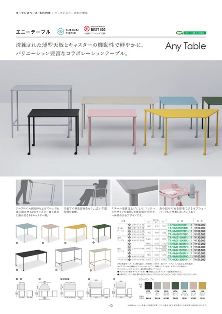 オープンスペース・多目的室|オープンスペース向け家具エニーテーブル※当時の“エニーウェイ”で受賞グリーン購入法適合洗練された薄型天板とキャスターの機動性で軽やかに。バリエーション豊富なコラボレーションテーブル。テーブルの片側を持ち上げて一人でも楽に動かせる2本キャスター脚と自由に動かせる4本キャスター脚。天板下の構造部材をなくし、広い下肢空間を実現。スチール塗装仕上げにより、エッジレスデザインを実現。天板全体が同色で一体感のあるデザインです。身の回りの物を整理できるオプションパーツもご用意しました。P.47)仕様外寸法DW品番価格H72072014601800750750720900900台形テーブル正方形テーブル2本キャスター脚4本キャスター脚2本キャスター脚4本キャスター脚2本キャスター脚4本キャスター脚❶❷❸❹❺❻❼❽❾ハイカウンター天板/表面材:スチール(焼付塗装)天板厚み:19mm脚/スチール丸パイプ(φ28.6、焼付塗装)キャスター/φ40双輪キャスター(本体:ナイロン、車輪:ウレタン巻き)※ストッパー機能なしアジャスター/2本キャスター脚〉樹脂成型品(ナイロン)●ポリウレタン巻きキャスター仕様●本商品にゴムキャスターは装着できません。●品番内の□には、天板・脚の色記号(6A6A・2A2A・M1M1・Q6Q6・3939・9G9G・1S1S)が入ります。TAN-MS0909M1-□1TAN-MS0909MC-□1TAN-MS0707M1-□1TAN-MS0707MC-□1TAN-MZ1506M1-□1TAN-MZ1506MC-□1TAN-MK1809M1-□1TAN-MK1507M1-□1TAN-MK1507H1-□1TAN-MK0906M1-□1TAN-MK0906MC-□1TAN-CK1206H1-□1¥108,000¥108,000¥102,000¥102,000¥130,000¥130,000¥147,000¥128,000¥156,000¥103,000¥103,000¥154,0004本キャスター脚2本キャスター脚2本キャスター脚15007207201000角形テーブル650900750600100090060012007201200カラーサンプル天板・脚品番内色記号E6Aブラック6A6AE2Aライトグレー2A2AM1AホワイトブラウンM1M1Q6AディープグリーンQ6Q639Aアッシュターコイズ39399GAアッシュピンク9G9G1SAオリーブイエロー1S1S45※価格はメーカー希望小売価格(税抜)です。消費税、組立・配送費などの諸経費を別途申し受けます。2801110510TAN-CK1206H12801410660TAN-MK1507H1810・660810・660TAN-MS0909・0707M16851365TAN-MZ1506M11710・1410・810810・660・TAN-MK1809・1507・0906M151060098010001500●75098010001800・1500・900600900・750・700720●❼❽●1460750650700720❶〜❹900・750900・750700720●●●●