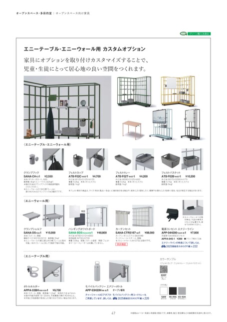 オープンスペース・多目的室|オープンスペース向け家具エニーテーブル・エニーウォール用カスタムオプション家具にオプションを取り付けカスタマイズすることで、児童・生徒にとって居心地の良い空間をつくれます。グリーン購入法適合〈エニーテーブル・エニーウォール用〉クランプフックSANA-CH-E21¥2,550本体/ポリカーボネート、ABS耐荷重/4kgfエニーワゴンは2kgf)※取付方法はクランプフックの取扱説明書をごらんください。※エニーウォールの1本の横フレームに取り付けられるクランプフックは3個までです。〈エニーウォール用〉フェルトカップATB-F02C-KKEF1¥4,700外寸法/W125×D125×H155重量/0.2kg本体/ポリエステル耐荷重/1kgfフェルトトレーATB-F02T-KKEF1¥4,200外寸法/W290×D125×H50重量/0.2kg本体/ポリエステル耐荷重/1kgfフェルトバスケットATB-F02B-KKEF1¥10,200外寸法/W375×D290×H170重量/0.7kg本体/ポリエステル耐荷重/5kgf※フェルト素材の商品は、サイズ・形状・風合い・色合いに個体差がある場合や、経年により変形したり、摩擦や水濡れにより色移り・変色、毛玉が発生する場合があります。背面クランプシェルフハンギングホワイトボードカーテンセット電源コンセントエナジーライン※エニーウォールへの取付時は、下記の専用ネジセットが必要です。併せてお求めください。SANA-DS-E2A1¥15,000本体/スチール、樹脂棚板サイズ/W318×D210耐荷重/2kgf※エニーウォールの最上段以外の横フレームに取付可能。1本のフレームに対して3個まで取付可能。SANA-BDS-E2AGVEB1¥48,800外寸法/W760×D12×H800有効板面/W730×H730質量/3.6kg板面/スチール塗装背面/フェルト※マーカー・イレーザーは付属していません。SANA-CTRS167-UB1¥88,000カーテン/ポリエステル(防炎仕様)カーテンレール/スチール、樹脂※ストレートウォールW1075には取付不可。防炎物品〈エニーテーブル用〉ボトルホルダーAPPA-03BH-E6A・E2A1¥6,700本体/スチール、樹脂耐荷重/1.2kgf有効内寸法/φ74mm※取付可能天板厚:19〜25mm。天板裏面の奥行:40mm以上。※天板と天板断面の形状により取り付けできない場合があります。モバイルバッテリーエナジーボトルAPP-03H20N-E6・E21オープン価格チャージャー+ACアダプタ・モバイルバッテリー用コードトレーもご用意しています。詳しくは、ß2025版総合カタログF編P.220天板厚15mm対応ネジセットAPP-04H200-SAW・E61¥7,000APPA-04S-1¥200●クランプ用ネジ2本エナジーラインの特長について詳しくは、ß2025版総合カタログF編P.222カラーサンプル〈フェルトカップ・フェルトトレー・フェルトバスケット〉KKEFストーングレー〈その他〉SAWホワイトE6・E6AブラックE2・E2Aライトグレー47※価格はメーカー希望小売価格(税抜)です。消費税、組立・配送費などの諸経費を別途申し受けます。