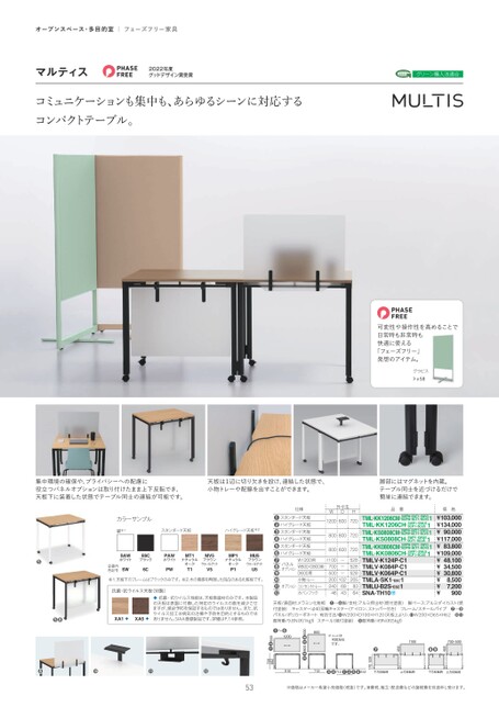 オープンスペース・多目的室|フェーズフリー家具マルティス2022年度グッドデザイン賞受賞グリーン購入法適合コミュニケーションも集中も、あらゆるシーンに対応するコンパクトテーブル。可変性や操作性を高めることで日常時も非常時も快適に使える「フェーズフリー」発想のアイテム。グラビス.58P脚部にはマグネットを内蔵。テーブル同士を近づけるだけで簡単に連結できます。品番価格TML-KK1206CM-SWPW・SWT1・SWV56CPW・6CT1・6CV51TML-KK1206CH-SWP1・SWU56CP1・6CU51TML-KS0808CM-SWPW・SWT1・SWV56CPW・6CT1・6CV51TML-KS0808CH-SWP1・SWU56CP1・6CU51TML-KK0806CM-SWPW・SWT1・SWV56CPW・6CT1・6CV51TML-KK0806CH-SWP1・SWU56CP1・6CU51TMLV-K124P-C1TMLV-K084P-C1TMLV-K064P-C1TMLA-SK1-E6C1TMLU-B2S-E6C1SNA-TH10Ω¥103,000¥134,00090,000¥¥117,00083,800¥¥109,000¥48,100¥34,50030,800¥8,500¥¥7,200¥900集中環境の確保や、プライバシーへの配慮に役立つパネルオプションは取り付けたまま上下反転でき、天板下に装着した状態でテーブル同士の連結が可能です。天板は1辺に切り欠きを設け、連結した状態で、小物トレーや配線を出すことができます。カラーサンプル脚※1スタンダード天板ハイグレード天板※2❺SAWホワイトE6CブラックPAWホワイト品番内色記号SW6CPWT1MT1ナチュラルオークMV5ブラウンウォールナットV5MP1ナチュラルオークP1MU5ブラウンウォールナットU5※1.天板下のフレームはブラックのみです。※2.木の質感を再現した凹凸のある化粧板です。抗菌・抗ウイルス天板(別製)❺❽XA1XA5抗菌・抗ウイルス性能は、天板表面材のみです。本製品の天板は表面に付着した特定のウイルスの数を減少させますが、感染予防を保証するものではありません。また、抗ウイルス加工は病気の治療や予防を目的とするものではありません。SIAA登録製品です。詳細はP.14参照。仕様❶スタンダード天板❷ハイグレード天板❸スタンダード天板❹ハイグレード天板❺スタンダード天板❻ハイグレード天板❼パネル❽❾オプションオプションW1200用W800/D800用D600用小物トレーコンセントトレーカバンフック外寸法DWH1200600720800800720800600720110070050020024046ーーー10268435285285282058364天板/表面材:メラミン化粧板❶〜❻脚/支柱:アルミ押出材(焼付塗装)脚ベース:アルミダイカスト(焼フレーム/スチールパイプ❼〜❾付塗装)キャスター:φ40双輪キャスター(ナイロン、ストッパー付き)パネル/ポリカーボネート有効寸法/W200×D100×H120天板上より)、W200×D65×H62耐荷重/9.8N(約1kgf)スチール(焼付塗装)耐荷重/49N(約5kgf)53※価格はメーカー希望小売価格(税抜)です。消費税、組立・配送費などの諸経費を別途申し受けます。1100700・500450❾❽450❼下方反転時上方反転時下方反転時上方反転時528170800※は木目方向です。❸❹800❺❻600❶〜❻1200❶❷600662720●●●●1110712❸❹712❶❷❺❻512