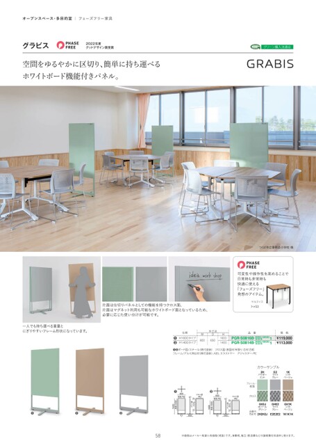 オープンスペース・多目的室|フェーズフリー家具グラビス2022年度グッドデザイン賞受賞空間をゆるやかに区切り、簡単に持ち運べるホワイトボード機能付きパネル。グリーン購入法適合つくば市立香取台小学校様可変性や操作性を高めることで日常時も非常時も快適に使える「フェーズフリー」発想のアイテム。一人でも持ち運べる重量とにぎりやすいフレーム形状になっています。片面は仕切りパネルとしての機能を持つクロス面、片面はマグネット利用も可能なホワイトボード面となっているため、必要に応じた使い分けが可能です。仕様❶❷H1600タイプH1400タイプ外寸法D650W800H16001400マルティス.53P品番PGR-S0816B-2H2H2J・E2E2E2PGR-S0814B-2H2H2J・E2E2E21K1K1K1K1K1K価格¥119,000¥113,00011❶❷ボード面/スチール(焼付塗装)クロス面/表面材:布張り芯材:合板フレーム/アルミ押出材(焼付塗装)、ABS、エラストマーアジャスター/PEカラーサンプルE2ライトパウダー2Hミントグレー1Kソフトベージュ58※価格はメーカー希望小売価格(税抜)です。消費税、組立・配送費などの諸経費を別途申し受けます。GH2JオパールグリーンGHE2ライトグレーGH1Kソフトベージュ2H2H2JE2E2E21K1K1Kフレーム・板面クロス品番内色記号51650PGR-S0816B51650PGR-S0814Bクロス面742975クロス面121241800板面742❷板面10001400クロス面7421175クロス面121241800板面742❶板面12001600❶❶❷