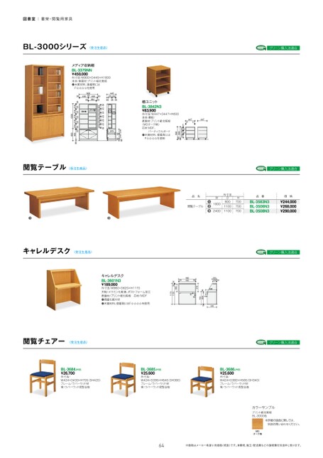 図書室|書架・閲覧用家具BL-3000シリーズ〈受注生産品〉グリーン購入法適合メディア収納棚BL-3379NN¥450,000外寸法/W900×D445×H1800本体/表面材:プリント紙化粧板●木質材料、接着剤にはF☆☆☆☆を使用9002330409234093643023445175152652825棚ユニット447171744717BL-3842171715515515553560065BL-3842N3¥83,900外寸法/W447×D447×H600本体・棚板/表面材:プリント紙化粧板(MDオーク柄)芯材:MDF、パーティクルボード●木質材料、接着剤にはF☆☆☆☆を使用219219802330370BL-33791:7515015030232323232330163163163163163163スライド棚固定棚30232162321623216120023216302162346560080カラーサンプルプリント紙化粧板BL-3000色※詳細の図面に関しては、別途お問い合わせください。MDオーク柄64※価格はメーカー希望小売価格(税抜)です。消費税、組立・配送費などの諸経費を別途申し受けます。閲覧テーブル〈受注生産品〉グリーン購入法適合❶❸品名閲覧テーブルW18002400❶❷❸外寸法D80011001100H700700700品番BL-3583N3BL-3506N3BL-3508N3価格¥244,000¥268,000¥290,000キャレルデスク〈受注生産品〉グリーン購入法適合52015600504701006507005050309609003025020020420302011051170キャレルデスクBL-3601N3¥189,000外寸法/W960×D620×H1170天板/メラミン化粧板、ポストフォーム加工表面材/プリント紙化粧板芯材/MDF●背面化粧付き●木質材料、接着剤にはF☆☆☆☆を使用閲覧チェアー〈受注生産品〉グリーン購入法適合BL-3684JY65¥26,700外寸法/W424×D430×H705(SH420)フレーム/ラバーウッド材背/ラバーウッド成型合板BL-3685JY65¥25,600外寸法/W424×D395×H645(SH380)フレーム/ラバーウッド材背/ラバーウッド成型合板BL-3686JY65¥25,600外寸法/W424×D360×H585(SH340)フレーム/ラバーウッド材背/ラバーウッド成型合板