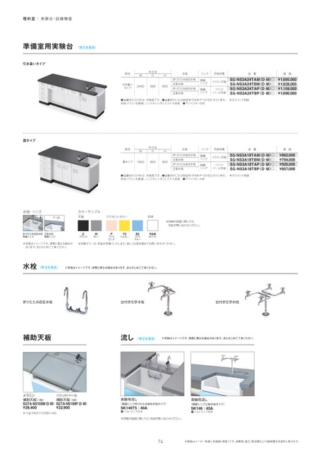 理科室|実験台・設備機器準備室用実験台〈受注生産品〉引き違いタイプ形状外寸法DWH引き違いタイプ2400900850水栓シンク天板材質品番折りたたみ自在水栓立型水栓折りたたみ自在水栓立型水栓陶器シンク陶器シンクメラミン天板ソリッドパール天板SG-NS3A24TAM(D¿M)¡SG-NS3A24TBM(D¿M)¡SG-NS3A24TAP(D¿M)¡SG-NS3A24TBP(D¿M)¡●品番内の(D・M)は、天板色です。●品番内の□には色記号(PAW・P・Y2・B2)が入ります。※ガスコック別途本体:メラミン化粧板、ノンスチレンポリエステル合板●アジャスター付き扉タイプ形状外寸法DWH扉タイプ1800900850水栓シンク天板材質品番折りたたみ自在水栓立型水栓折りたたみ自在水栓立型水栓陶器シンク陶器シンクメラミン天板ソリッドパール天板SG-NS3A18TAM(D¿M)¡SG-NS3A18TBM(D¿M)¡SG-NS3A18TAP(D¿M)¡SG-NS3A18TBP(D¿M)¡●品番内の(D・M)は、天板色です。●品番内の□には色記号(PAW・P・Y2・B2)が入ります。※ガスコック別途本体:メラミン化粧板、ノンスチレンポリエステル合板●アジャスター付き価格¥1,095,000¥1,028,000¥1,159,000¥1,090,000価格¥862,000¥794,000¥926,000¥857,000水栓・シンクカラーサンプル天板アクセントカラー本体※詳細の図面に関しては、別途お問い合わせください。折りたたみ自在水栓陶器シンク立型水栓陶器シンク※写真はイメージです。実際と異なる場合があります。あらかじめご了承ください。DブラックMグレーPライトピンクY2イエローB2ライトブルーPAWホワイト※別製カラーは、別途お見積りいたします。詳しくは担当者までお問い合わせください。水栓〈受注生産品〉※写真はイメージです。実際と異なる場合があります。あらかじめご了承ください。折りたたみ自在水栓台付き化学水栓台付き化学水栓補助天板流し〈受注生産品〉※写真はイメージです。実際と異なる場合があります。あらかじめご了承ください。メラミン補助天板(1枚)SGTA-NS100M(D¿M)¥28,400外寸法/W557×D380×t45ソリッドパール補助天板(1枚)SGTA-NS100P(D¿M)¥32,900実験用流し(陶器シンク折りたたみ自在水栓タイプ)SK146T5|40A●ベルトラップ付き実験用流し(陶器シンク立型水栓タイプ)SK146|40A●ベルトラップ付き※詳細の図面に関しては、別途お問い合わせください。74※価格はメーカー希望小売価格(税抜)です。消費税、組立・配送費などの諸経費を別途申し受けます。