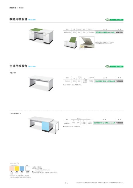 家庭科室|被服台教師用被服台〈受注生産品〉生徒用被服台〈受注生産品〉平台タイプミシン1台用タイプグリーン購入法適合形状幅奥行き高さ天板タイプ品番価格教師用被服台1800900800メラミン化粧板SG-NH1A18HMPAW¿P¿Y2¿B2N¥642,000品評会の際に、作品展示ができるよう天板を持ち上げることができます。ストッパー付きグリーン購入法適合形状W外寸法D平台タイプ1800900HM:760L:700S:640天板タイプメラミン化粧板●品番内の(M・L・S)は、天板高さです。品番価格SG-NH2A18(M¿L¿S)MPAWN¥279,000形状ミシン1台用タイプ外寸法DW1800900HL:700S:640天板タイプメラミン化粧板品番価格SG-NH2B18(L¿S)MPAW¿P¿Y2¿B2N¥369,000●品番内の(L・S)は、天板高さです。カラーサンプルアクセントカラー本体PライトピンクY2イエローB2ライトブルーPAWホワイト※別製カラーは、別途お見積りいたします。詳しくは担当者までお問い合わせください。〈被服台共通仕様〉本体/メラミン化粧板、ノンスチレンポリエステル合板●アジャスター付き※詳細の図面に関しては、別途お問い合わせください。84※価格はメーカー希望小売価格(税抜)です。消費税、組立・配送費などの諸経費を別途申し受けます。