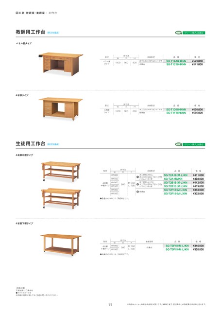 図工室・技術室・美術室|工作台教師用工作台〈受注生産品〉パネル脚タイプ4本脚タイプ生徒用工作台〈受注生産品〉4本脚中棚タイプ❶❷4本脚下棚タイプ〈共通仕様〉天板材質/ナラ集成材●アジャスター付き※詳細の図面に関しては、別途お問い合わせください。グリーン購入法適合形状パネル脚タイプ外寸法DWH1800900800本体形状品番木工万力(HW150)×1付き作業台SG-T1A18HKNNSG-T1C18HKNN価格¥573,000¥541,000形状4本脚タイプ外寸法DWH1800900800本体形状品番木工万力(HW150)×1付き作業台SG-T1D18HKNNSG-T1F18HKNN価格¥698,000¥666,000グリーン購入法適合外寸法DH900M:760L:700形状4本脚中棚タイプWW1800W1500W1800W1500W1800W1500●品番内の(M・L)は、天板高さです。本体形状品番❶❷木工用削り台なし木工万力(SGV-T5)×2付きハネムシ×4ヶ所木工用削り台付き木工万力(SGV-T5)×2付きハネムシ×4ヶ所❸作業台SG-T2A18(M¿L)KNSG-T2A15MKNSG-T2B18(M¿L)KNSG-T2B15(M¿L)KNSG-T2F18(M¿L)KNSG-T2F15(M¿L)KN価格¥411,000¥392,000¥442,000¥419,000¥353,000¥332,000形状4本脚下棚タイプWW1800W1500外寸法D900HM:760L:700●品番内の(M・L)は、天板高さです。本体形状作業台品番SG-T3F18(M¿L)KNSG-T3F15(M¿L)KN価格¥346,000¥320,00088※価格はメーカー希望小売価格(税抜)です。消費税、組立・配送費などの諸経費を別途申し受けます。