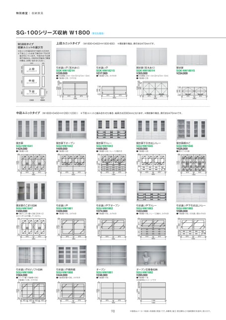 87020201800870202087020180020×8702023870202018008702020870202018008702023開き扉SGK-NW1801S¥234,00020560600引き違い戸(笠木あり)SGK-NW1821H¥339,000●笠木部調整幅-25mm〜+5mm(笠木寸法75mm〜105mm)●可動棚×2枚、カギ付き引き違い戸SGK-NW1821S¥217,000●可動棚×2枚、カギ付き開き扉(笠木あり)SGK-NW1801H¥355,000●笠木部調整幅-25mm〜+5mm(笠木寸法75mm〜105mm)●可動棚×2枚20100(笠木)86090010002056060020100(笠木)8609001000上段ユニットタイプ(W1800×D450×H1000・600)※開き扉の場合、奥行きは470mmです。W1800タイプ収納ユニットの選び方※各ユニットから組み合わせてお選びいただけます。※下段ユニットは全て奥行き170の天板が付いています。下段のみでは使用できません。D625の天板をご要望の際は、お問い合わせください。1800450770下段ユニットタイプ正面図625側面図上段ユニットタイプ中段ユニットタイプ1000・600123080020116712304320870201800870202087087020201800208321230204320870201800870202067720123047043870201800870202083212302043203152087087020201800201167123043開き扉SGU-NW1841¥424,000●可動棚×4枚開き扉下オープンSGU-NW1842¥409,000●可動棚×4枚開き扉下トレーSGU-NW1843¥469,000●可動棚×4枚、トレー12個付き開き扉下引き出しトレーSGU-NW1845¥630,000●可動棚×4枚開き扉網かごSGU-NW1846¥626,000●網かご×24個中段ユニットタイプ(W1800×D450×H1200(1230))※下段ユニットと組み合わせた場合、総高さは2000mmとなります。※開き扉の場合、奥行きは470mmです。特別教室|収納家具SG-100シリーズ収納W1800〈受注生産品〉20870201800870202083212302031543208702018008702020677201230470432087087020201800208321230203154387020180087020201167123020438702020180020870432011671230※価格はメーカー希望小売価格(税抜)です。消費税、組立・配送費などの諸経費を別途申し受けます。1760180020203002084712302043870202018009820425204252042520425202087018008702020870201800201167123043201167123043201167123043引き違い戸AVソフト収納SGU-NW1866¥564,000●スライド棚(可動棚×6枚)可動棚×12枚、カギ付き引き違い戸傾斜棚SGU-NW1868¥444,000●可動傾斜棚×6枚、カギ付きオープンSGU-NW1881¥246,000●可動棚×4枚オープン石膏像収納SGU-NW1882¥285,000●可動棚×1枚※収納物はイメージです開き扉のこぎり収納SGU-NW1847¥490,000●可動のこぎり棚×2個(28本×2)※のこぎりは付属していません引き違い戸SGU-NW1861¥409,000●可動棚×4枚、カギ付き引き違い戸下オープンSGU-NW1862¥374,000●可動棚×4枚、カギ付き引き違い戸下トレーSGU-NW1863¥453,000●可動棚×4枚、トレー12個付、カギ付き●可動棚×4枚、引き違い扉カギ付き引き違い戸下引き出しトレーSGU-NW1865¥596,000