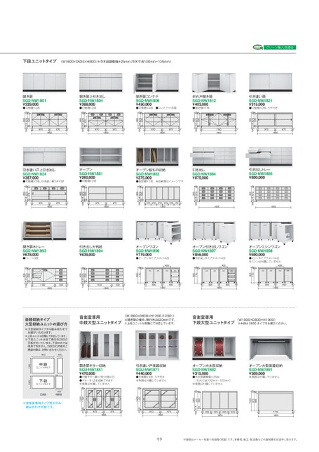 下段ユニットタイプ(W1800×D625×H800)※巾木部調整幅+25mm(巾木寸法100mm〜125mm)グリーン購入法適合開き扉SGD-NW1801¥329,000●可動棚×2枚開き扉上引き出しSGD-NW1804¥388,000●可動棚×2枚開き扉コンテナSGD-NW1806¥450,000●可動棚×4枚●コンテナ×18個折れ戸開き扉SGD-NW1812¥403,000●固定棚×1枚引き違い扉SGD-NW1821¥315,000●可動棚×2枚、カギ付き20302030203020302030208708702020180020100(巾木)63067080020176018002020100(巾木)630670800208708702020180020100(巾木)630670800208708702020180047020100(巾木)670800208708702020180020100(巾木)630670800オープンミシンワゴンSGD-NW1898¥690,000●ミシンタイプワゴン×4台※ミシンは付属していません4002030770800オープンワゴンSGD-NW1896¥719,000●オープンタイプワゴン×4台オープン引き出しワゴンSGD-NW1897¥856,000●引き出しタイプワゴン×4台4002030770800400203077080020116020500201800408502018008504040850201800850404085020180085040208708702020180020100(巾木)630670800208708702020180047020100(巾木)670800開き扉木トレーSGD-NW1893¥678,000●トレー×3枚引き出し大判紙SGD-NW1894¥639,0002030203020100(巾木)6306708002011602050020180020100(巾木)630670800引き出しトレーSGD-NW1885¥800,000180030100(巾木)670800引き出しSGD-NW1884¥675,000180030100(巾木)6708002027627627627627627620180020100(巾木)630670800引き違い戸上引き出しSGD-NW1824¥387,000●可動棚×2枚、引き違い扉カギ付きオープンSGD-NW1881¥260,000●可動棚×2枚オープン板もの収納SGD-NW1882¥275,000●固定棚×1枚※収納物はイメージです203020302030楽器収納タイプ大型収納ユニットの選び方音楽室専用中段大型ユニットタイプ(W1800×D600×H1200(1230))※開き扉の場合、奥行きは620mmです。※上段ユニットは別製にて対応しています。音楽室専用下段大型ユニットタイプ(W1800×D800×H1000)※中段はD600タイプをお選びください。※大型収納タイプから組み合わせてお選びいただけます。※上段ユニットは別製にて対応しています。※下段ユニットは全て奥行き200の天板が付いています。下段のみでは使用できません。D800の天板をご要望の際は、お問い合わせください。99※価格はメーカー希望小売価格(税抜)です。消費税、組立・配送費などの諸経費を別途申し受けます。85308859701000204252042520425204252040180017201800402030830870100020100(巾木)870201800870202011671230202023870201800870202011671230202023開き扉ギター収納SGU-NW1851¥470,000●可動ギター棚×2枚(6個×2)●ギターを12本収納できます※楽器は付属していません引き違い戸楽器収納SGU-NW1871¥440,000●可動棚×4枚、カギ付き※楽器は付属していませんオープン大太鼓収納SGD-NW1892¥315,000●巾木部調整幅+25㎜(巾木寸法100mm〜125mm)※楽器は付属していませんオープン大型楽器収納SGD-NW1891¥309,000※楽器は付属していません1800600中段ユニットタイプ下段ユニットタイプ12001000正面図800側面図※音楽室専用タイプ同士のみ、組み合わせ可能です。