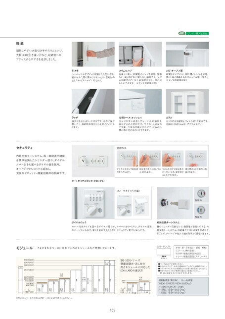 機能開閉しやすい大型引き手やスリムヒンジ、大開口3枚引き違い戸など、収納物へのアクセスのしやすさを追求しました。グリーン購入法適合引き手ユニバーサルデザインに配慮した大型引き手。握りやすく、開け閉めしやすいため、収納物の出し入れがスムーズに行えます。スリムヒンジ従来より薄い、新開発のヒンジを採用。壁際など、扉が90°以上開かない場所でもヒンジが邪魔することなく、収納物をスムーズに出し入れできます。※ランマ収納庫は除く180°オープン扉両開きタイプには、180°開くヒンジを採用。開けた扉が通路をふさがないよう配慮しました。※ランマ収納庫は除くセキュリティ内筒交換キーシステム、施・解錠表示機能を標準装備したシリンダー錠や、ダイヤルカバー付きも選べるダイヤル錠を採用。オートダイヤルロックも追加し、充実のセキュリティ機能搭載の収納庫です。ラッチ扉や引き出しはラッチ付きです。自然に扉が開いたり、収納物の飛び出しを防ぐことができます。名刺ケース(オプション)分かりやすい名差しプレートは、収納物を表示するのに便利です。マグネット式なので児童・生徒の目線に合わせて、好みの位置に取り付けることができます。ガラスガラス戸は飛散防止フィルム貼りで安全です。(BWU-SG89SAWは、アクリルです。)使用方法ダイヤルを回して暗証番号を入力します。暗証番号を入力後、つまみを回します。つまみを回すと暗証番号がリセットされ、扉を開けることができます。扉を閉めると自動的に施錠されます。オートダイヤルロック(ゼロックE)カバー付きタイプ(別製)施錠時解錠時ダイヤルロックカバー付きタイプも選べるダイヤル錠です。カバー付きタイプは、ダイヤル部をカバーしているので、周りを気にすることなく、セキュリティ面でも安心です。内筒交換キーシステム鍵のシリンダー交換だけで、鍵管理が容易に行える、内筒交換キーシステム。収納庫やワゴンの鍵を共通化することで、グループや個人で鍵を効率よく管理できます。モジュールさまざまなスペースに合わせられるモジュールをご用意しております。D4502560(2600)2360(2400)2160(2200)1812(1852)1245(1285)1110(1150)975(1015)762(802)660(700)ベースH60(H100)天板H20本体H700本体H915本体H1050本体H1750※SG-100シリーズの工作台はP.87〜、流し台はP.73をごらんください。ランマH400本体H1185本体H915本体H2100本体H2100SG-100シリーズ壁面実験台・流し台の高さモジュールに対応したEDIALABOの選び方800760ベースH80H40天板H20本体H700ベースH40本体H700ベースH80カラーサンプルSAWホワイト本体・扉・引き出し・鏡板・棚板/スチール、焼付塗装引き手/樹脂成型品(ABS)トレー/樹脂成型品(スチロール)●ベースは必ずご使用ください。●本体は必ず上下・左右が連結されていることを確認ください。●ラテラルキャビネットは、転倒防止のため壁・床に固定してください。●H2100タイプをご使用の場合は、壁面にセットし、壁・床に固定することをおすすめします。棚板耐荷重(等分布)トレー耐荷重W900・D450用/490N(約50kgf)A4浅型/9.8N(約1.0kgf)A4深型/19.6N(約2.0kgf)A3浅型/19.6N(約2.0kgf)105