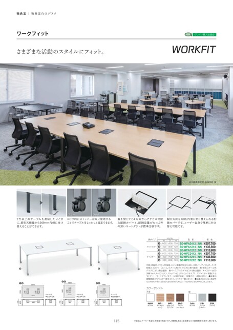 開口方向を外側/内側に切り替えられる配線カバーです。ユーザー自身で簡単に付け替え可能です。職員室|職員室向けデスクワークフィットさまざまな活動のスタイルにフィット。フリーロック脚タイプアジャスターキャスター外寸法D120014001200120014001200W❶2400❷1200❸1200❹2400❺1200❻1200H720720720720720720グリーン購入法適合品川翔英中学校・高等学校様品番価格SD-WFA2412□NNSD-WFA1214□NNSD-WFA1212□NNSD-WFC2412□NNSD-WFC1214□NNSD-WFC1212□NN¥207,700¥135,800¥115,900¥207,700¥135,800¥115,900天板/表面材:メラミン化粧板、エッジ:樹脂押出材(ABS)、芯材:パーティクルボード、天板厚み:25mmフレーム/スチール角パイプ(□40、焼付塗装)脚/支柱:スチール角パイプ(□45、焼付塗装)脚ベース:アルミダイカスト(焼付塗装)キャスター:φ50双輪キャスター(ウレタン、ストッパー付、リフトロックタイプ)アジャスター:樹脂(エラストマー)コードダクト/スチール(焼付塗装)配線カバー/樹脂(ABS)●床傾斜調整範囲/アジャスター脚:34mm、キャスター脚:25mm●品番内の□には、色記号(SAAMAW・P81MAW・E6AMAW・SAAMT1・E6AMP2・E6AMV5)が入ります。カラーサンプル天板脚※は木目方向です。❻1200240❸❻24012001200240❷❺2401400※は木目方向です。※は木目方向です。2402402402401200❶❹2400❹115※価格はメーカー希望小売価格(税抜)です。消費税、組立・配送費などの諸経費を別途申し受けます。MT1ナチュラルオークMP2ラスティックミディアムMV5ブラウンウォールナットSAAホワイトP81フラットシルバーE6AブラックMAWホワイト305268652720268305652720305895305268652720