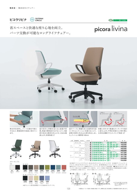 職員室|職員室向けチェアーピコラリビナ省スペースと快適な座り心地を両立。パーツ交換が可能なロングライフチェアー。グリーン購入法適合クッション層座芯材68mm〈大柄な人〉強い力でロッキング〈小柄な人〉弱い力でロッキング強い力弱い力5°❶〜❺※❻〜※〜86〜6〜88〜86〜68〜※耐アルコール・耐次亜塩素酸ナトリウム性能を持ったレザーです。C10-(B・W)12C10-(B・W)11※455は肘内間寸法(肘先端部)です。座面幅は全タイプ480mmです。120※価格はメーカー希望小売価格(税抜)です。消費税、組立・配送費などの諸経費を別途申し受けます。仕様樹脂脚色ホワイトハイバックブラック布布エコPVCレザーホワイト布ローバックブラック布エコPVCレザー張り地本体色品番価格ホワイト❶ホワイト❷ブラック❸ホワイト❹ブラック❺❻ホワイト❼ブラック❽ホワイト❾ブラックホワイトC10-W12CW-E1C10-B12C(W・G)-E1C10-B12C(W・G)-BKC10-B12S(W・G)-E1C10-B12S(W・G)-BKC10-W11CW-E1C10-B11C(W・G)-E1C10-B11C(W・G)-BKC10-B11S(W・G)-E1C10-B11S(W・G)-BK11VZ641G9YK・G9Q6・G9T6G939・G90TG9B6・G9M6・G9YK・G9Q6G9Q4・G9T6・G939・G90TG9B6・G9M6・G9YK・G9Q6G9Q4・G9T6・G939・G90TVZMD・VZL1VZ62VZE6G9YK・G9Q6・G9T6G939・G90TG9B6・G9M6・G9YK・G9Q6G9Q4・G9T6・G939・G90TG9B6・G9M6・G9YK・G9Q6G9Q4・G9T6・G939・G90TVZMD・VZL1VZ62VZE611VZ6411111¥63,500¥58,000¥58,000¥60,600¥60,600¥57,200¥51,700¥51,700¥54,000¥54,000背/背板:PP、クッション:スラブウレタン、張り地:〈布〉ポリエステル、〈レザー〉エコPVC座/座板:PP、クッション:モールドウレタン、張り地:〈布〉ポリエステル、〈レザー〉エコPVC脚/脚羽根:強化ナイロン、キャスター:〈Wキャスター〉車輪径φ50mm、Gキャスター〉車輪径φ50mm、ステップ:スチール丸パイプ(粉体塗装)●品番内の(W)はナイロンキャスター仕様、G)はゴム単輪キャスター仕様です。※パーツ交換をご希望の場合は、お客様相談室またはお買い上げの販売店へご相談ください。※ホワイト脚は、クリーンテクトコーティング仕様です。❶カラーサンプル本体❽背・座(布)E1ホワイトグレーBKブラックG9B6ブラックG9M6ダークグレージュG9YKソフトベージュG9Q6ディープグリーンG9Q4ライトオリーブ背・座(エコPVCレザー)※VZE6ブラックVZMDホワイトベージュVZL1ペールライムVZ64ミディアムマリンVZ62ライトマリンG9T6プルシアンブルーG939アッシュターコイズG90Tソフトテラコッタ