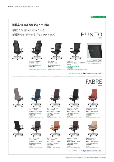 ダイヤ柄をステッチした高級感のあるキルティングを背もたれの表裏に配置。丁寧な縫製による上質な仕上がりが、シックな空間を演出します。職員室|校長室・応接室向けチェアー紹介校長室・応接室向けチェアー紹介学校で採用いただいている革張りやレザータイプをピックアップ。グリーン購入法適合プントヘッドレスト付きタイプ革張りアルミ肘ハイバック革張りアルミ肘CR-GA2469F6L7E6-W¥394,000外寸法/W680×D585〜850×H1130〜1220CR-GA2467F6L7E6-W¥336,000外寸法/W680×D580〜800×H965〜1055ハイバックエコPVCレザー張り(キルティングタイプ)アルミ肘CR-GA2467F6VZE6-W¥207,500外寸法/W680×D585〜805×H970〜1060この他のバリエーションは、ß2025版総合カタログF編P.380〜ファブレアディショナルバックプレーンタイプ革張りアルミサークル肘C01-P261LU-B6R6R2¥341,500外寸法/W680×D585×H1075〜1165アディショナルバックプレーンタイプ革張りアルミサークル肘C01-P261LU-B0G0G2¥341,500外寸法/W680×D585×H1075〜1165アディショナルバックストライプタイプ革張りアルミサークル肘C01-P262LU-BB6B62¥354,600外寸法/W680×D585×H1075〜1165アディショナルバックストライプタイプ革張りアルミパネル肘C01-P282LU-BALAL2¥377,600外寸法/W680×D585×H1075〜1165スタンダードバックプレーンタイプ革張りアルミサークル肘C01-P161LU-B0G0G2¥316,900外寸法/W680×D570×H905〜995スタンダードバックプレーンタイプ革張りアルミサークル肘C01-P161LU-BMKMK2¥316,900外寸法/W680×D570×H905〜995スタンダードバックストライプタイプ革張りアルミサークル肘C01-P162LU-B06062¥330,000外寸法/W680×D570×H905〜995スタンダードバックストライプタイプ革張りアルミパネル肘C01-P182LU-BM1M12¥353,000外寸法/W680×D570×H905〜995この他のバリエーションは、ß2025版総合カタログF編P.384〜121※価格はメーカー希望小売価格(税抜)です。消費税、組立・配送費などの諸経費を別途申し受けます。