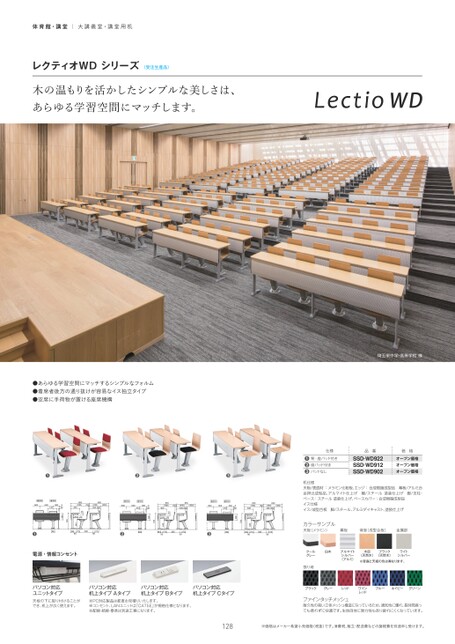 埼玉栄中学・高等学校様仕様❶背・座パッド付き❷座パッド付き❸パッドなし品番SSD-WD922SSD-WD912SSD-WD902価格オープン価格オープン価格オープン価格机仕様天板/表面材:メラミン化粧板、エッジ:合成樹脂成型品幕板/アルミ合金押出成型品、アルマイト仕上げ棚/スチール塗装仕上げ脚/支柱・ベース:スチール塗装仕上げ、ベースカバー:合成樹脂成型品イス仕様イス/成型合板脚/スチール、アルミダイキャスト、塗装仕上げカラーサンプル天板(メラミン)幕板背座(成型合板)金属部クールグレー白木アルマイトシルバー(アルミ)木目(天然木)ブラック(天然木)ライトシルバー※背座と天板の色は異なります。張り地ブラックグレーレッドワインレッドブルーネイビーグリーンファインタッチメッシュ耐久性の高い立体メッシュ構造になっているため、通気性に優れ、長時間座っても蒸れずに快適です。生地自体に弾力性もあり疲れにくくなっています。体育館・講堂|大講義室・講堂用机レクティオWDシリーズ〈受注生産品〉木の温もりを活かしたシンプルな美しさは、あらゆる学習空間にマッチします。●あらゆる学習空間にマッチするシンプルなフォルム●着席者後方の通り抜けが容易なイス独立タイプ●空席に手荷物が置ける座席機構❶❷❸850(360)(490)400(90)(62)850(788)4007020070350280430720離席時着席時600600300410850(360)(490)400(90)(62)850(788)4007020070350280445720850(490)400(90)(360)離席時着席時600600300410850(788)(62)7020070400350280445720離席時着席時600600300410❶1501421755851759090SSD-WD922❷1501421755851759090SSD-WD912❸1501421755851759090SSD-WD902電源・情報コンセントパソコン対応ユニットタイプ天板の下に取り付けることができ、机上が広く使えます。パソコン対応机上タイプAタイプ※PC対応製品は都度お見積りいたします。※コンセント、LANユニットは「CAT5E」が規格仕様となります。※配線・結線・器具は別途工事になります。パソコン対応机上タイプBタイプパソコン対応机上タイプCタイプ128※価格はメーカー希望小売価格(税抜)です。消費税、組立・配送費などの諸経費を別途申し受けます。