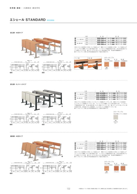 ❶❷❸❹プレス棚仕様通し棚仕様仕様手動シートライジング自動シートライジング手動シートライジング自動シートライジング品番価格SSD-240CR¶SSD-340CR¶SSD-260CR¶SSD-360CR¶オープン価格/1席(アンカー別途)オープン価格/1席(アンカー別途)オープン価格/1席(アンカー別途)オープン価格/1席(アンカー別途)天板/メラミン化粧板貼り(CR色)、エッジ:塗装仕上げ幕板/メラミン化粧板貼り(CR色)エッジ:塗装仕上げフレーム/75×25鋼管、メラミン焼付塗装(F2色)ベースキャップ:樹脂成型品(F3色)背・座/成型合板、ウレタン塗装(ナチュラル色)棚/スチールプレス品、メラミン焼付塗装(F2色)通し棚:中質繊維板t12¶マークは、グリーン購入法の特定調達品目内で、不適合の商品です。プレス棚通し棚❶❷❸❹プレス棚仕様通し棚仕様仕様手動シートライジング自動シートライジング手動シートライジング自動シートライジングカラーサンプル天板・幕板(メラミン化粧板)(成形合板)(中質繊維板)背・座通し棚CRチェリーナチュラル品番価格SSD-A240MF1¶SSD-A340MF1¶SSD-A260MF1¶SSD-A360MF1¶オープン価格/1席(アンカー別途)オープン価格/1席(アンカー別途)オープン価格/1席(アンカー別途)オープン価格/1席(アンカー別途)天板/メラミン化粧板貼り(CR色)、エッジ:オレフィン系樹脂(ダークグレー色)幕板/メラミン化粧板貼りエッジ:オレフィン系樹脂(ダークグレー色)フレーム/75×25鋼管、メラミン焼付塗装(F5色)ベースキャップ:樹脂成型品(F3色)背・座/成型合板、ウレタン塗装(ライトグレー色)棚/スチールプレス品、メラミン焼付塗装(F5色)通し棚:メラミン化粧板貼りエッジ:オレフィン系樹脂(ダークグレー色)¶マークは、グリーン購入法の特定調達品目内で、不適合の商品です。カラーサンプル天板・幕板(メラミン化粧板)F1ナチュラルグレー品番価格❶❷❸❹プレス棚仕様通し棚仕様仕様手動シートライジング自動シートライジング手動シートライジング自動シートライジングSSD-440CR¶SSD-540CR¶SSD-460CR¶SSD-560CR¶オープン価格/1席(アンカー別途)オープン価格/1席(アンカー別途)オープン価格/1席(アンカー別途)オープン価格/1席(アンカー別途)天板/メラミン化粧板貼り(CR色)、エッジ:塗装仕上げ幕板/メラミン化粧板貼り(CR色)、エッジ:塗装仕上げフレーム/75×25鋼管、メラミン焼付塗装(F2色)ベースキャップ:樹脂成型品(F3色)背・座/成型合板、ウレタン塗装(ナチュラル色)棚/スチールプレス品、メラミン焼付塗装(F2色)通し棚:中質繊維板t12¶マークは、グリーン購入法の特定調達品目内で、不適合の商品です。カラーサンプル天板・幕板(メラミン化粧板)(成形合板)(中質繊維板)背・座通し棚800135330(最小ピッチ)800350400❶1740(30+560×3+30)(最小ピッチ)608003508001351740(30+560×3+30)607003304207003056056056030302405602404553024030560560560303024056024045530240❶❷SSD-240・340❸❹SSD-260・360直立脚・モノトーンタイプ800135330❶(最小ピッチ)608003504001740(30+560×3+30)(最小ピッチ)800603508001351740(30+560×3+30)7003304207003056056056030302405602404553024030560560560303024056024045530240❶❷SSD-A240・A340❸❹SSD-A260・A360傾斜脚・木目タイプ(最小ピッチ)800350800(144)330400❶1740(30+560×3+30)(176)(最小ピッチ)800350800(144)1740(30+560×3+30)(176)7007003304200700体育館・講堂|大講義室・講堂用机エシェールSTANDARD〈受注生産品〉直立脚・木目タイプ3056056056030302405802405603024030560560560303024058024056030240❶❷SSD-440・540❸❹SSD-460・560CRチェリーナチュラル132※価格はメーカー希望小売価格(税抜)です。消費税、組立・配送費などの諸経費を別途申し受けます。