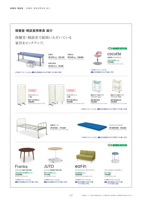 保健室・相談室|保健室・相談室用家具紹介保健室・相談室用家具紹介保健室・相談室で採用いただいている家具をピックアップ。診察台足置き台HP-D4TVZ62¥93,100外寸法/W1800×D650×H550HP-D4FVZ62¥28,800外寸法/W370×D300×H250診察台用枕HP-DC7VZ62¥6,300外寸法/W310×D110×H75グリーン購入法適合患者用イス〈ココット〉CR-CG542E1VZ92¥72,500外寸法/φ500×H570〜660この他のバリエーションは、ß2025版総合カタログF編デジタル版P.948この他のバリエーションは、ß2025版総合カタログF編P.733防炎物品クロススクリーン〈1連〉PCY-1C-P81W1¥26,900外寸法/W900×D400×H1835防炎物品クロススクリーン〈2連〉脱衣カゴ〈1段タイプ〉(キャスターなし)脱衣カゴ〈2段タイプ〉(キャスター付き)PCY-2C-P81W1¥53,800外寸法/W1805×D400×H1835HP-DK10BN¥20,200外寸法/W520×D325×H645HP-DK20CWN¥25,500外寸法/W520×D325×H685この他のバリエーションは、ß2025版総合カタログF編デジタル版P.948病院用ベッドHP-B100F1¥73,400外寸法/W910×D2130×H1000ファイバーマットレスHP-BM70NN¥50,500外寸法/W850×D1910×H100この他のバリエーションは、ß2025版総合カタログF編デジタル版P.961グリーン購入法適合フランカ(木脚・円形天板)TFK-WC1212MW-W5P51¥230,800外寸法/φ1200×H720MT-JTJE9SAWMT1¥77,500外寸法/φ900×H720この他のバリエーションは、この他のバリエーションは、ß2025版総合カタログF編P.184〜ß2025版総合カタログF編P.478〜ジュート(単柱脚・円形天板)イートインシリーズ〈ソファー〉スツール(ビニールレザー)CN-M872G6NL9¥209,000外寸法/W1250×D805×H725この他のバリエーションは、ß2025版総合カタログF編デジタル版P.792CK-750B2¥18,900外寸法/φ405×H455この他のバリエーションは、ß2025版総合カタログF編デジタル版P.848137※価格はメーカー希望小売価格(税抜)です。消費税、組立・配送費などの諸経費を別途申し受けます。