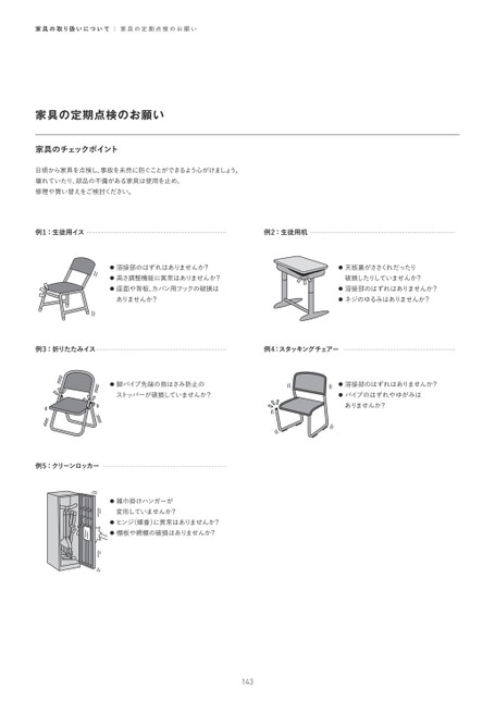 家具の取り扱いについて|家具の定期点検のお願い家具の定期点検のお願い家具のチェックポイント日頃から家具を点検し、事故を未然に防ぐことができるよう心がけましょう。壊れていたり、部品の不備がある家具は使用を止め、修理や買い替えをご検討ください。例1:生徒用イス例2:生徒用机●溶接部のはずれはありませんか?●高さ調整機能に異常はありませんか?●座面や背板、カバン用フックの破損はありませんか?●天板裏がささくれだったり破損したりしていませんか?●溶接部のはずれはありませんか?●ネジのゆるみはありませんか?例3:折りたたみイス例4:スタッキングチェアー●脚パイプ先端の指はさみ防止のストッパーが破損していませんか?●溶接部のはずれはありませんか?●パイプのはずれやゆがみはありませんか?例5:クリーンロッカー●雑巾掛けハンガーが変形していませんか?●ヒンジ(蝶番)に異常はありませんか?●棚板や網棚の破損はありませんか?143