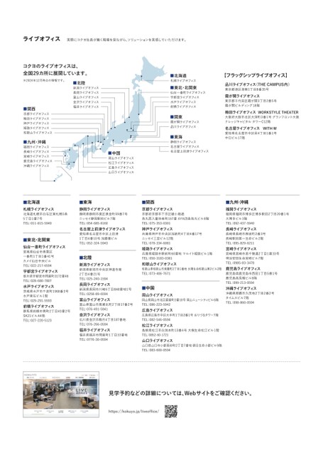 ライブオフィス実際にコクヨ社員が働く現場を見ながら、ソリューションを実感していただけます。コクヨのライブオフィスは、全国29カ所に展開しています。※2024年12月時点の情報です。■関西京都ライブオフィス梅田ライブオフィス神戸ライブオフィス姫路ライブオフィス和歌山ライブオフィス■九州・沖縄福岡ライブオフィス長崎ライブオフィス宮崎ライブオフィス鹿児島ライブオフィス沖縄ライブオフィス■北海道札幌ライブオフィス北海道札幌市白石区東札幌5条5丁目1番7号TEL:011-815-5940■東北・北関東仙台一番町ライブオフィス宮城県仙台市青葉区一番町1丁目1番41号カメイ仙台中央ビルTEL:022-217-6594宇都宮ライブオフィス栃木県宇都宮市問屋町3172番48TEL:028-680-7807水戸ライブオフィス茨城県水戸市千波町1968番3号水戸東石ビル1階TEL:029-291-5593前橋ライブオフィス群馬県前橋市南町2丁目43番2号SK21ビルA4階TEL:027-220-5123■北陸新潟ライブオフィス長岡ライブオフィス富山ライブオフィス金沢ライブオフィス福井ライブオフィス■中国岡山ライブオフィス松江ライブオフィス広島ライブオフィス山口ライブオフィス■北海道札幌ライブオフィス■東北・北関東仙台一番町ライブオフィス宇都宮ライブオフィス水戸ライブオフィス前橋ライブオフィス■関東霞が関ライブオフィス品川ライブオフィス■東海静岡ライブオフィス名古屋ライブオフィス名古屋上前津ライブオフィス【フラッグシップライブオフィス】品川ライブオフィス(THECAMPUS内)東京都港区港南1丁目8番35号霞が関ライブオフィス東京都千代田区霞が関3丁目2番5号霞が関ビルディング18階梅田ライブオフィスWORKSTYLETHEATER大阪府大阪市北区大深町3番1号グランフロント大阪ナレッジキャピタルタワーC12階名古屋ライブオフィスWITHW愛知県名古屋市中区栄4丁目1番1号中日ビル17階■東海静岡ライブオフィス静岡県静岡市葵区黒金町59番7号ニッセイ静岡駅前ビル7階TEL:054-685-8160名古屋上前津ライブオフィス愛知県名古屋市中区上前津1丁目4番10号加藤憲ビルTEL:052-324-5943■北陸新潟ライブオフィス新潟県新潟市中央区神道寺南2丁目4番21号TEL:025-240-1594長岡ライブオフィス新潟県長岡市川崎6丁目848番地1号TEL:0258-89-6594富山ライブオフィス富山県富山市黒瀬北町2丁目17番2号TEL:076-491-5941金沢ライブオフィス石川県金沢市鞍月4丁目187番地TEL:076-266-0594福井ライブオフィス福井県福井市問屋町1丁目33番地TEL:0776-30-0594■関西京都ライブオフィス京都府京都市下京区綾小路通烏丸西入童侍者町167番AYA四条烏丸ビル8階TEL:075-353-0301神戸ライブオフィス兵庫県神戸市中央区加納町4丁目4番17号ニッセイ三宮ビル12階TEL:078-334-6081姫路ライブオフィス兵庫県姫路市駅前町60番地マルイト姫路ビル1階TEL:050-3183-0381和歌山ライブオフィス和歌山県和歌山市美園町2丁目1番地太陽生命和歌山第2ビル2階TEL:073-406-7671■中国岡山ライブオフィス岡山県岡山市北区磨屋町3番10号岡山ニューシティビル6階TEL:086-223-5942広島ライブオフィス広島県広島市中区大手町1丁目2番1号おりづるタワー7階TEL:082-546-0594松江ライブオフィス島根県松江市白潟本町13番4号大樹生命松江ビル1階TEL:0852-60-1721山口ライブオフィス山口県山口市小郡高砂町2丁目7番地朝日生命小郡ビル9階TEL:083-600-0594■九州・沖縄福岡ライブオフィス福岡県福岡市博多区博多駅前2丁目20番1号大博多ビル3階TEL:092-437-5940長崎ライブオフィス長崎県長崎市西坂町2番3号長崎駅前第一生命ビル2階TEL:095-829-6211宮崎ライブオフィス宮崎県宮崎市高千穂通2丁目1番33号明治安田生命宮崎ビル7階TEL:0985-83-3478鹿児島ライブオフィス鹿児島県鹿児島市西田1丁目5番1号鹿児島高見橋ビル8階TEL:099-213-0594沖縄ライブオフィス沖縄県那覇市久茂地2丁目2番2号タイムスビル7階TEL:098-860-0594見学予約などの詳細については、Webサイトをご確認ください。https://kokuyo.jp/liveoffice/