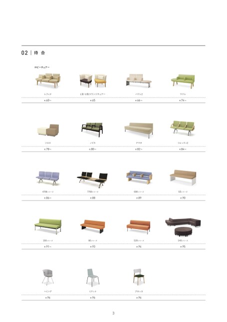 02待合ロビーチェアーレフィナP.60〜L型・U型ラウンジチェアーP.65ソロスP.78〜ノドカP.80〜パドレ2P.66〜アマタP.82〜マドレP.74〜コレッティ2P.84〜4700シリーズP.86〜7700シリーズP.88600シリーズP.89SSシリーズP.90150シリーズP.91〜60シリーズP.93520シリーズP.94140シリーズP.95ヘミングP.96ミケットP.96プロッカP.963