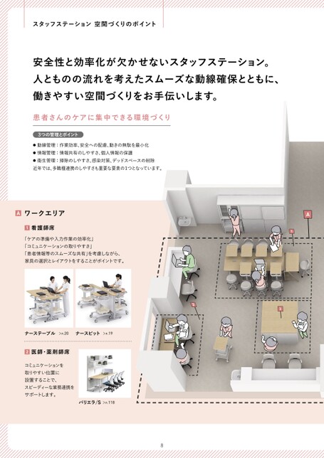 スタッフステーション空間づくりのポイント安全性と効率化が欠かせないスタッフステーション。人とものの流れを考えたスムーズな動線確保とともに、働きやすい空間づくりをお手伝いします。患者さんのケアに集中できる環境づくり3つの管理とポイント●動線管理:作業効率、安全への配慮、動きの無駄を最小化●情報管理:情報共有のしやすさ、個人情報の保護●衛生管理:掃除のしやすさ、感染対策、デッドスペースの削除近年では、多職種連携のしやすさも重要な要素の1つとなっています。A123Aワークエリア1看護師席「ケアの準備や入力作業の効率化」「コミュニケーションの取りやすさ」「患者情報等のスムーズな共有」を考慮しながら、家具の選択とレイアウトをすることがポイントです。ナーステーブルP.20ナースピットP.192医師・薬剤師席コミュニケーションを取りやすい位置に設置することで、スピーディーな業務連携をサポートします。バリエラ/SP.1188