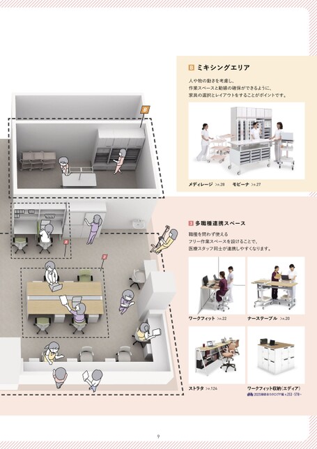 22Bミキシングエリア人や物の動きを考慮し、作業スペースと動線の確保ができるように、家具の選択とレイアウトをすることがポイントです。BメディレージP.28モビーナP.273多職種連携スペース職種を問わず使えるフリー作業スペースを設けることで、医療スタッフ同士が連携しやすくなります。ワークフィットP.22ナーステーブルP.20ストラタP.124ワークフィット収納(エディア)ß2025版総合カタログF編P.253・578〜9