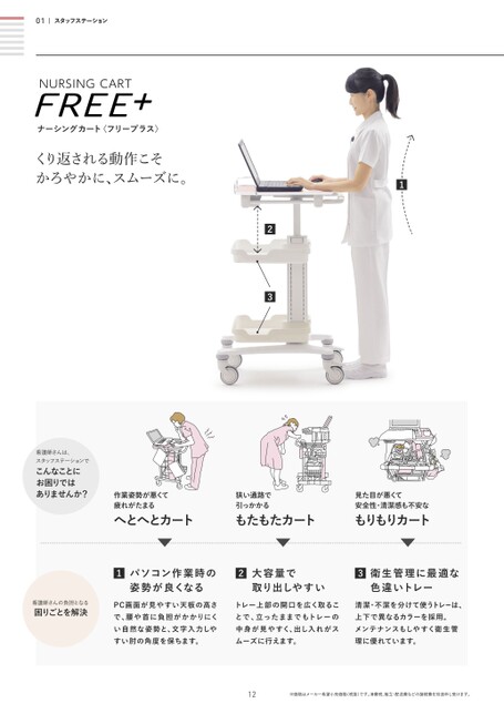 01スタッフステーションナーシングカート〈フリープラス〉くり返される動作こそかろやかに、スムーズに。123看護師さんは、スタッフステーションでこんなことにお困りではありませんか?作業姿勢が悪くて疲れがたまるへとへとカート狭い通路で引っかかるもたもたカート見た目が悪くて安全性・清潔感も不安なもりもりカート看護師さんの負担となる困りごとを解決1パソコン作業時の姿勢が良くなるPC画面が見やすい天板の高さで、腰や首に負担がかかりにくい自然な姿勢と、文字入力しやすい肘の角度を保ちます。2大容量で取り出しやすいトレー上部の開口を広く取ることで、立ったままでもトレーの中身が見やすく、出し入れがスムーズに行えます。3衛生管理に最適な色違いトレー清潔・不潔を分けて使うトレーは、上下で異なるカラーを採用。メンテナンスもしやすく衛生管理に優れています。12※価格はメーカー希望小売価格(税抜)です。消費税、組立・配送費などの諸経費を別途申し受けます。
